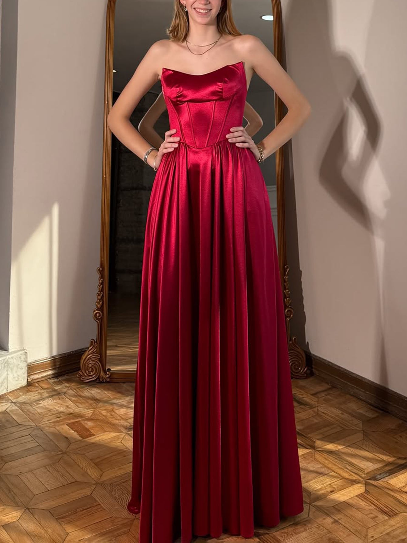 Lace Up Pleated Bodice A-Line Long Prom Dress With Detachable Strap - Red