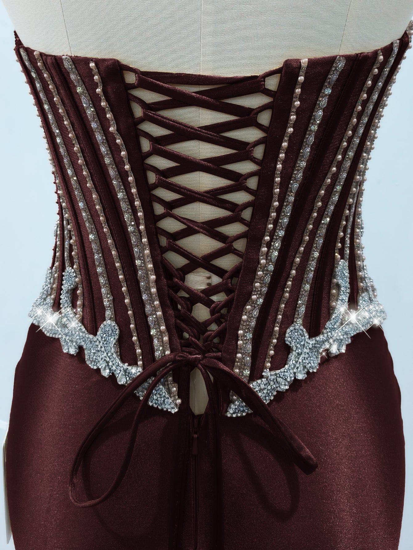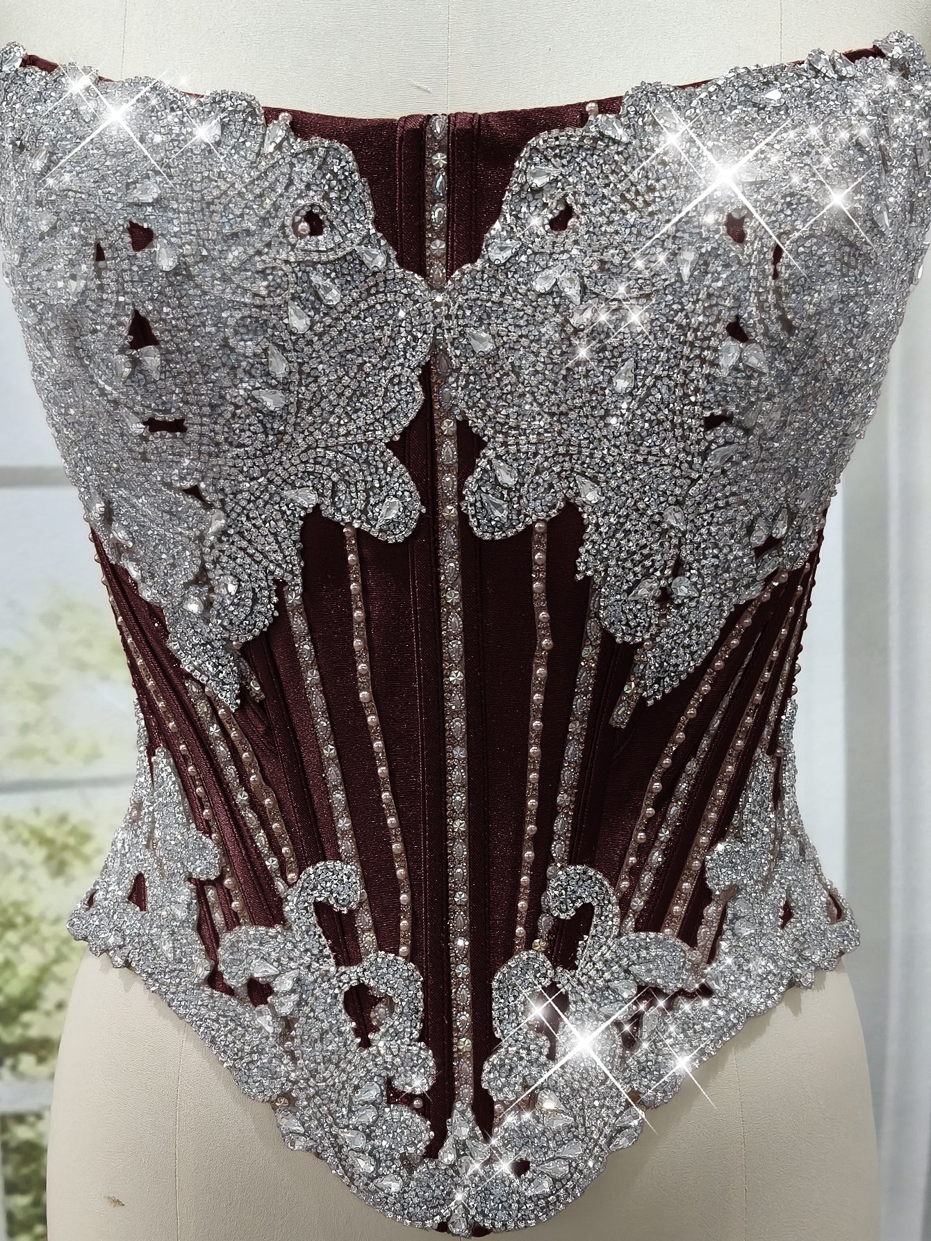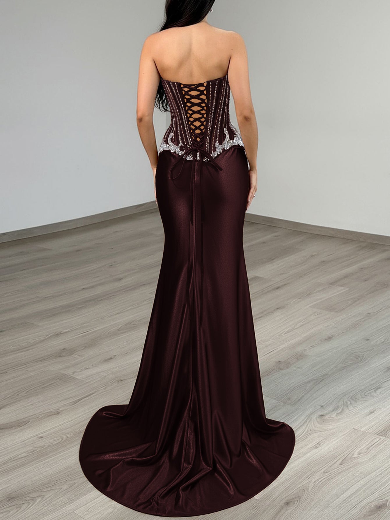 Luxury Crystal Strapless Sheer Bodice Mermaid Evening Dress - Burgundy