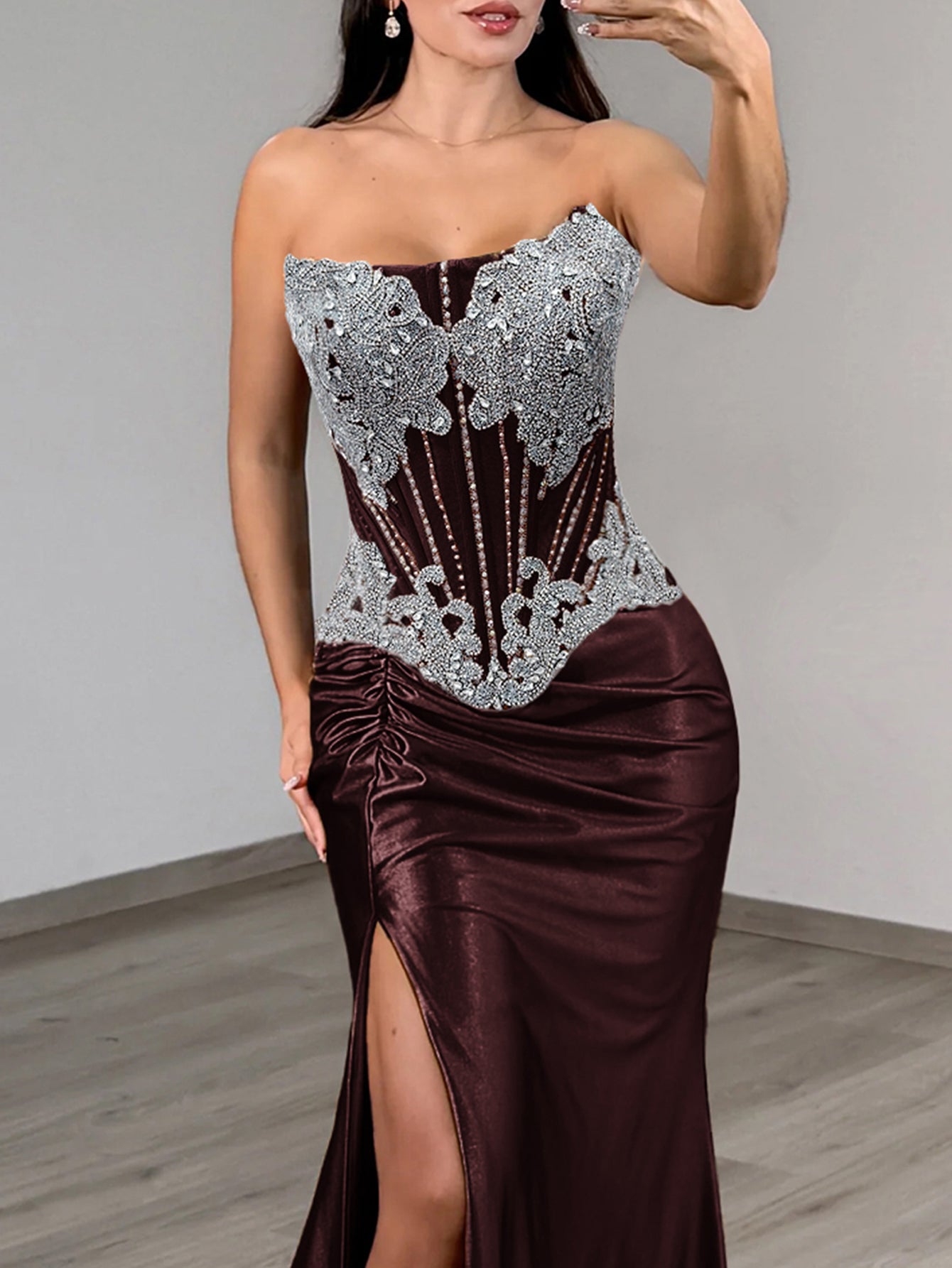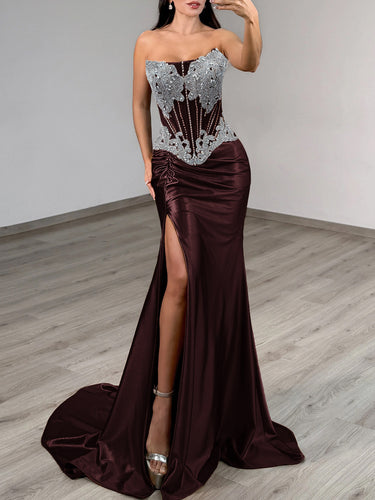 This satin prom gown features crystal bust on the bodice. The strapless luxury dress has a ruched and split hem. Worldprom mermaid prom dresses are ideal for party, evening or festivals.
