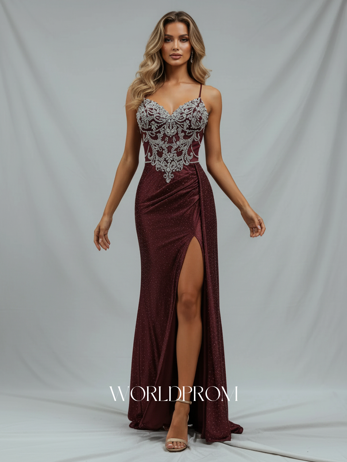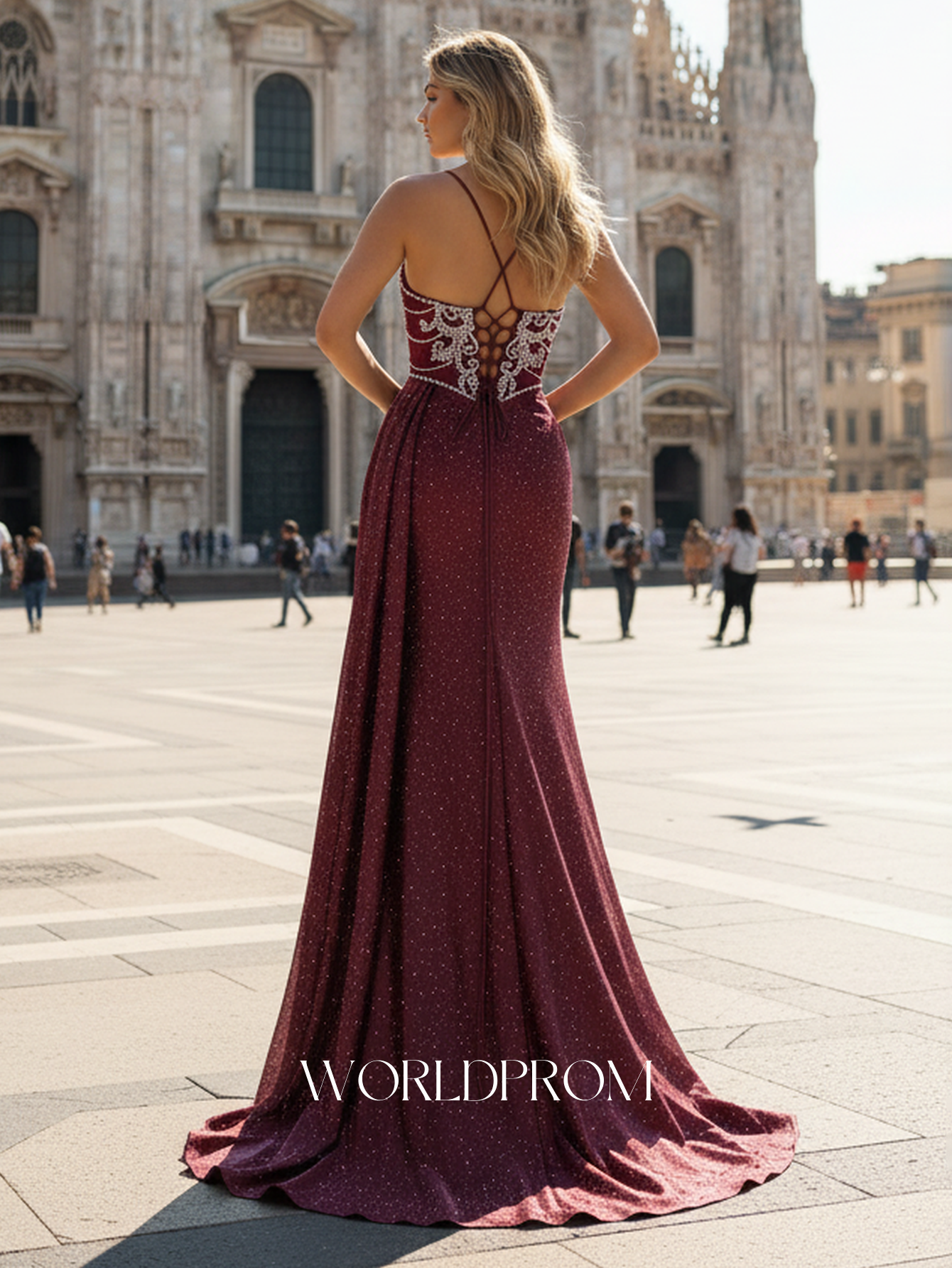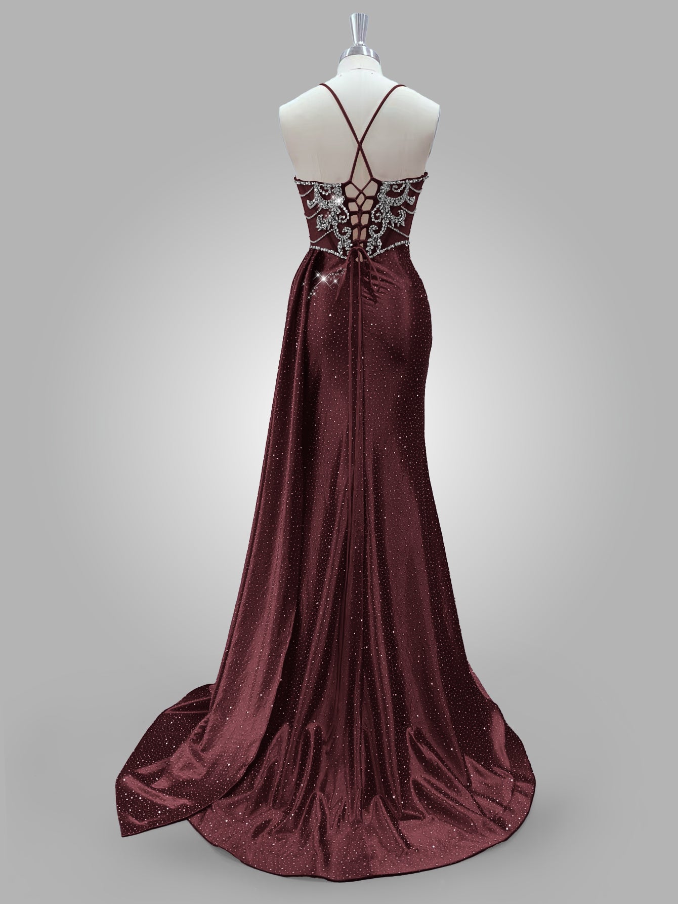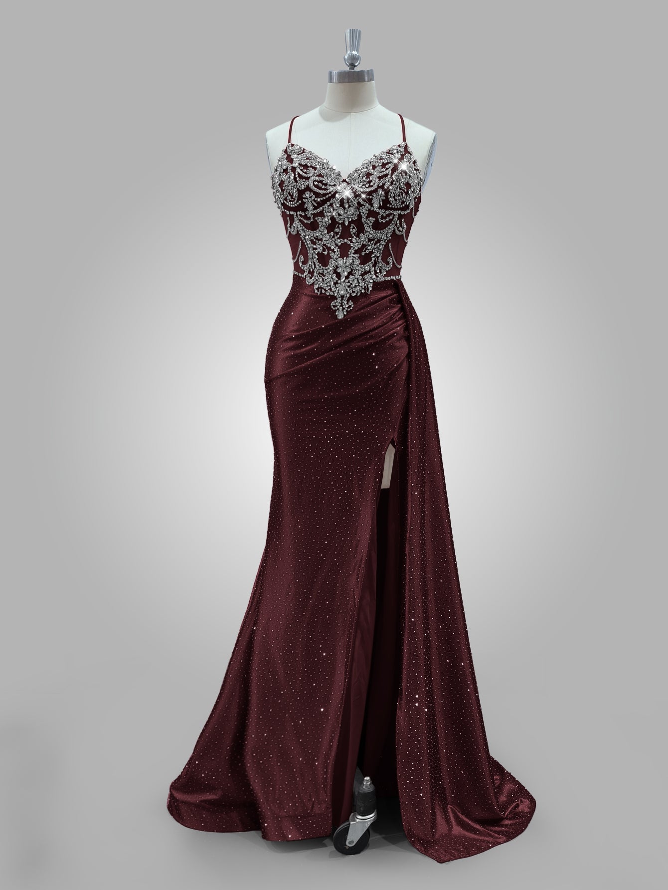 Details: Backless, Lace Embroidery, Crystals, Split, With Waist Drop, Illusion, Sheer, Pleated