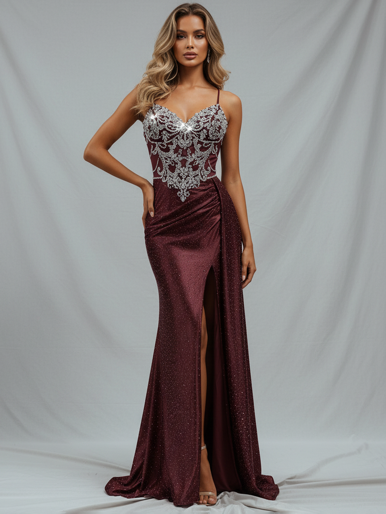 Luxury Lace Embroidery Crystal Mermaid Prom Dress With Waist Drop - Burgundy