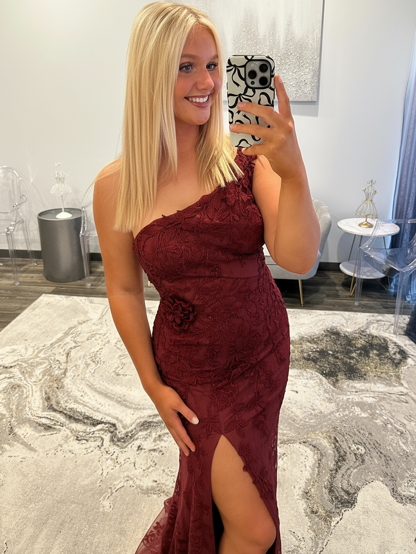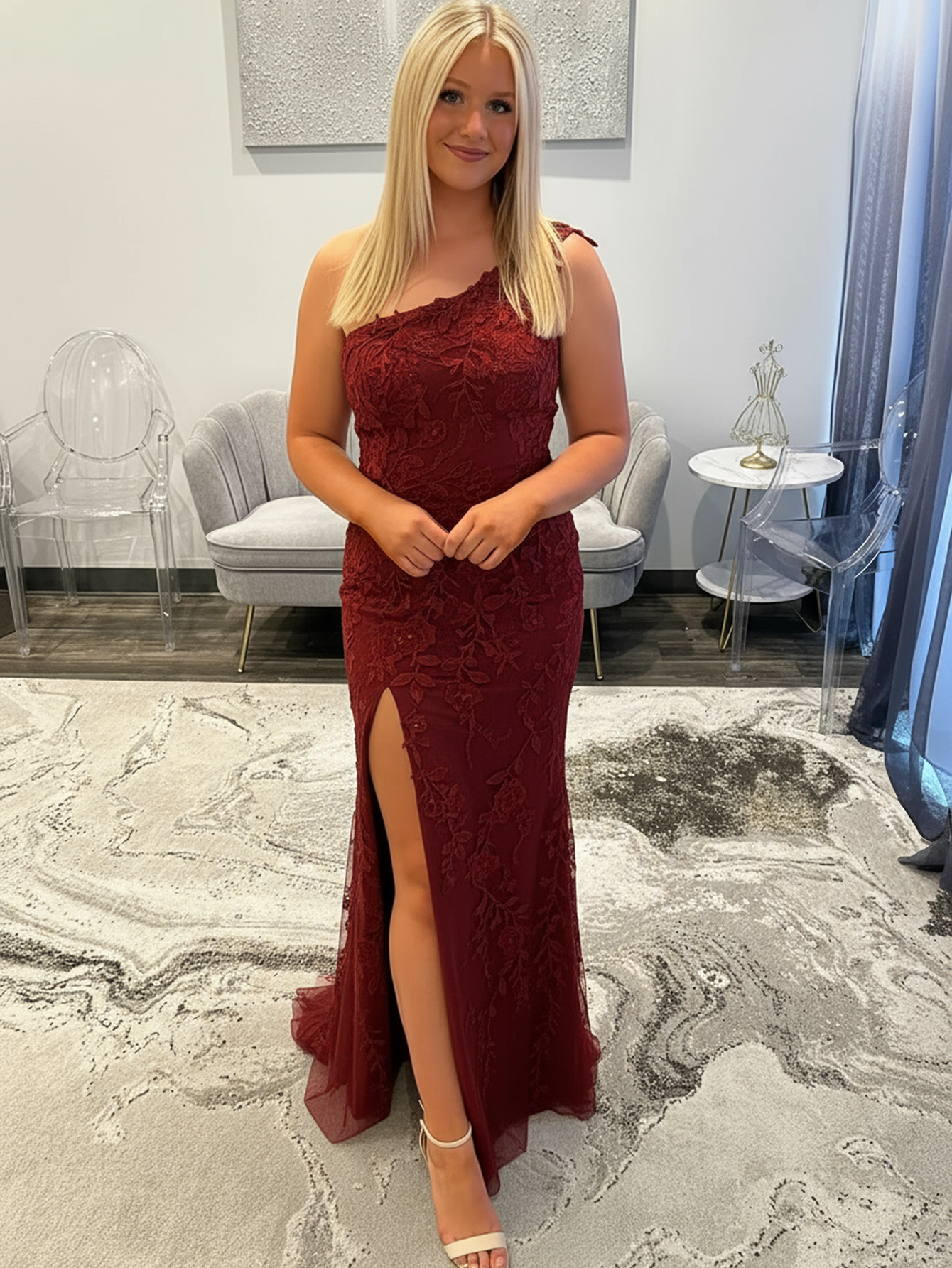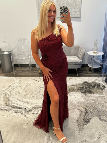 One Shoulder Lace 3D Rose Prom Dress With Slit - Burgundy