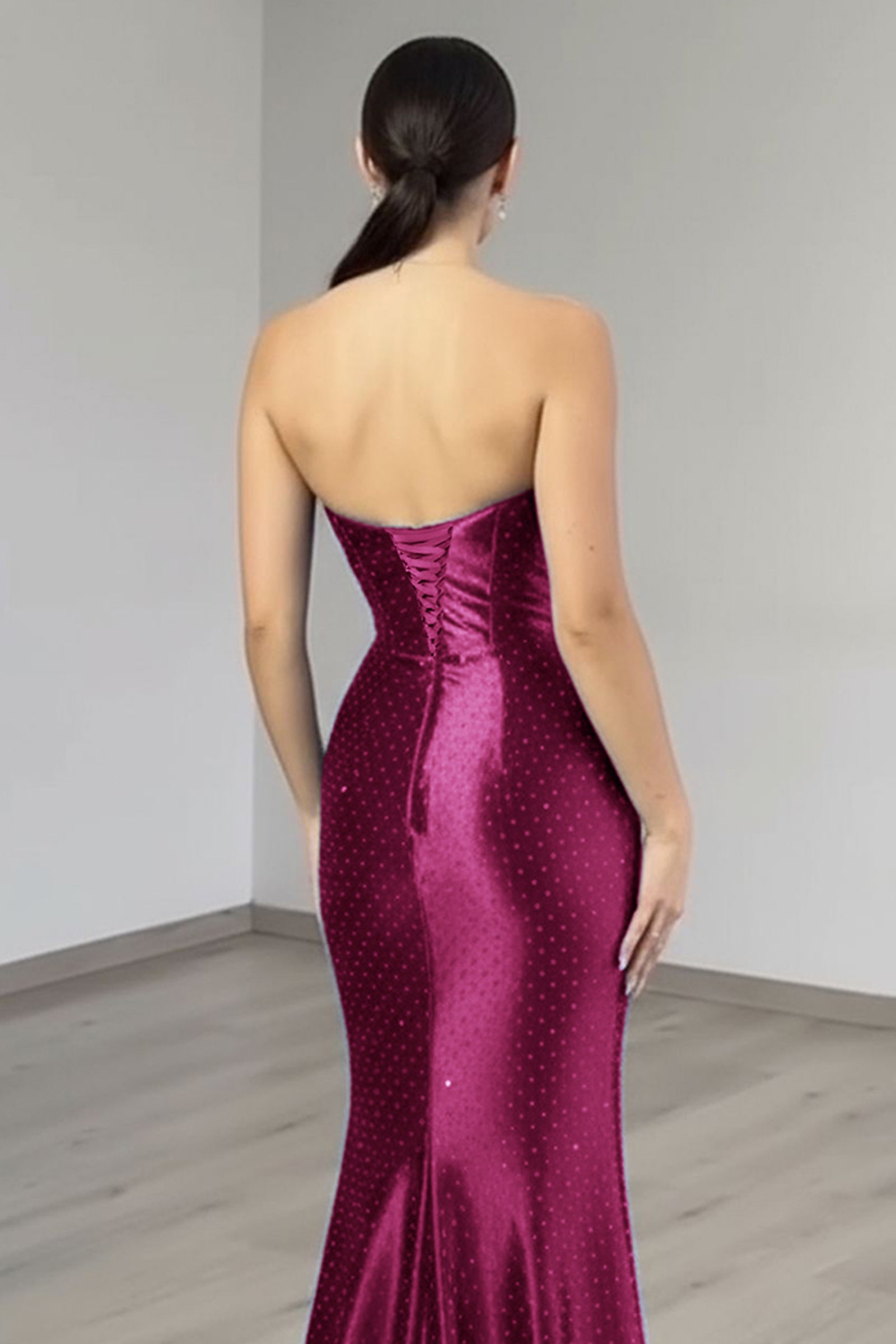This luxury evening dress features satin with crystal on the bust. The strapless prom dress has a scoop neck and split hem. This dubai sexy evening dress is ideal for party, evening or homecoming events.
