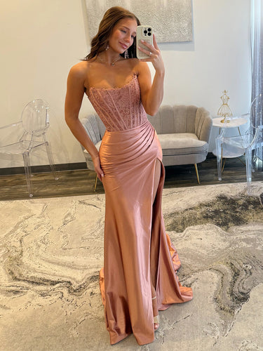 Boned Lace Embroidery Mermaid Prom Dress With Slit - Rose Gold