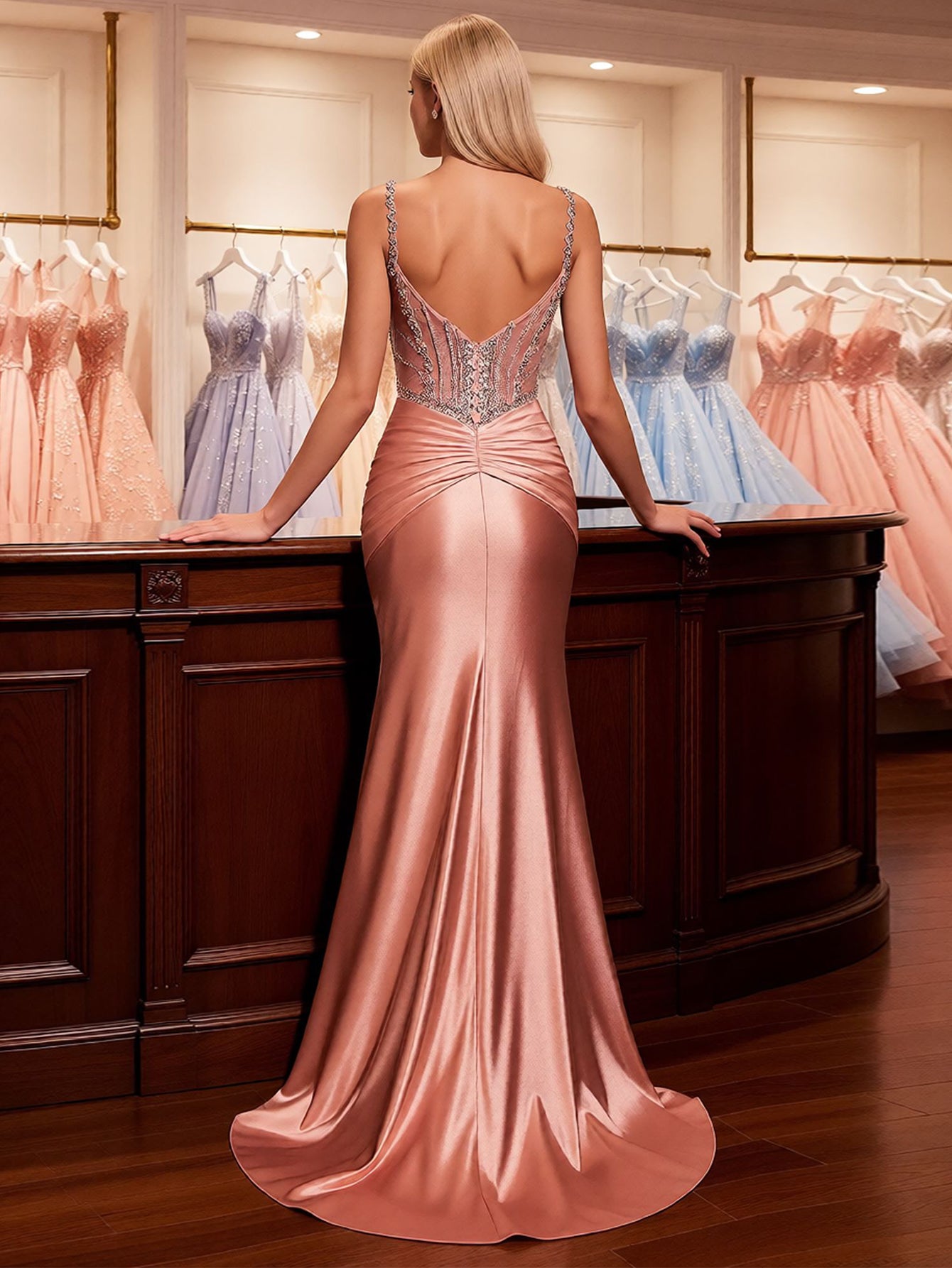 Details: Backless, Crystal, Ruched, Illusion, Beading