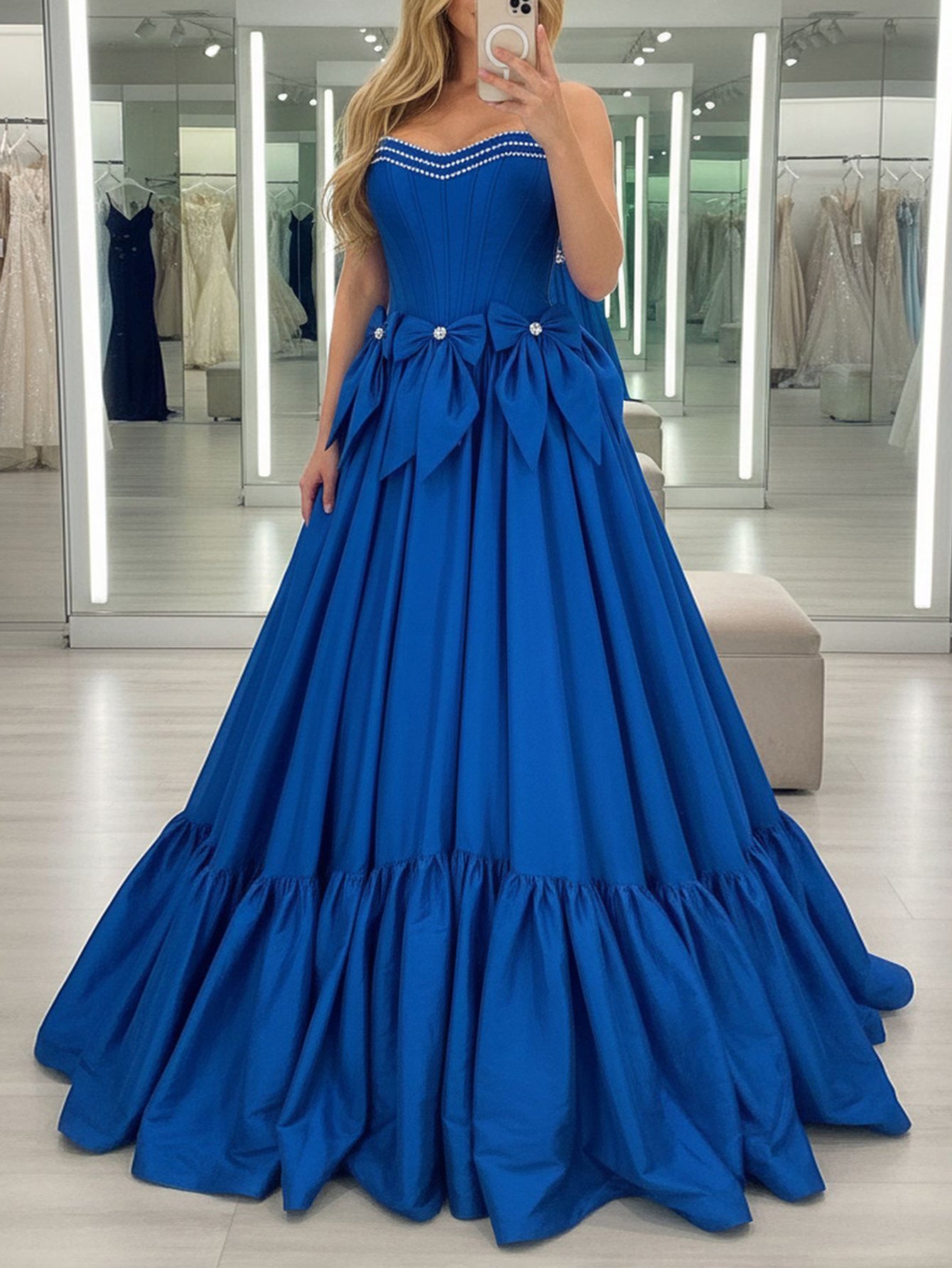 Boned Top Strapless Beaded Ball Gown Prom Dress With Bow - Royal Blue