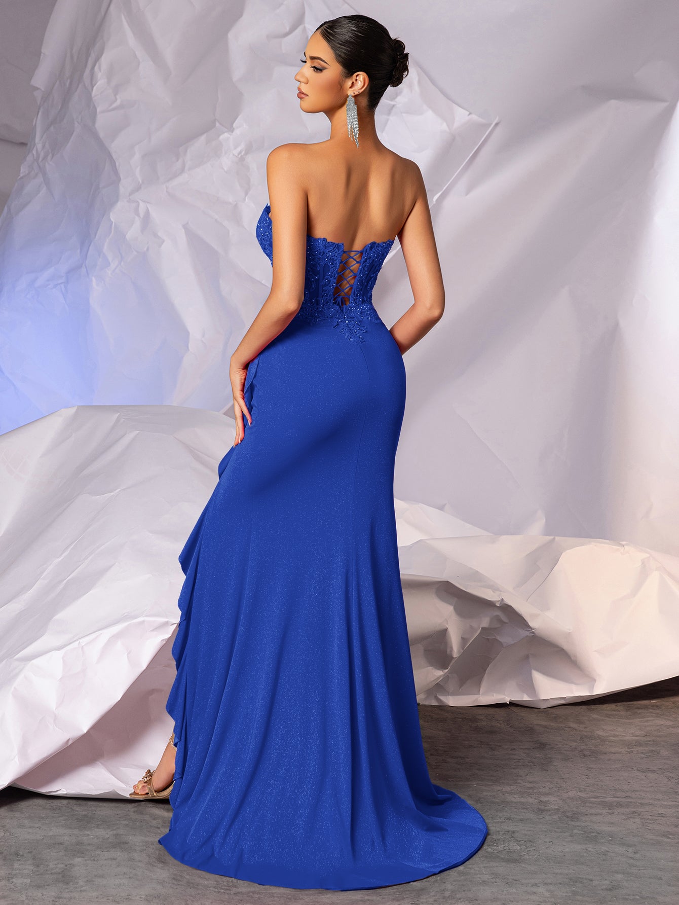 Details: Backless, Fitted Waist, Lace Embroidery, Crystal, Ruffle