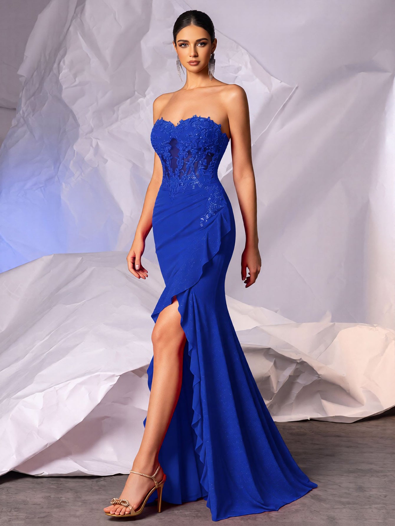 Crystal Lace Embroidery Mermaid Prom Dress With Ruffle - Royal Blue
