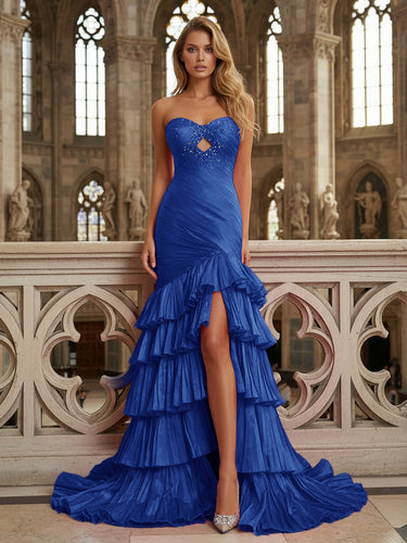 Cut Front Sparkly Beading Bow Back Ruched Bodice Mermaid Long Prom Dress With Slit - Royal Blue