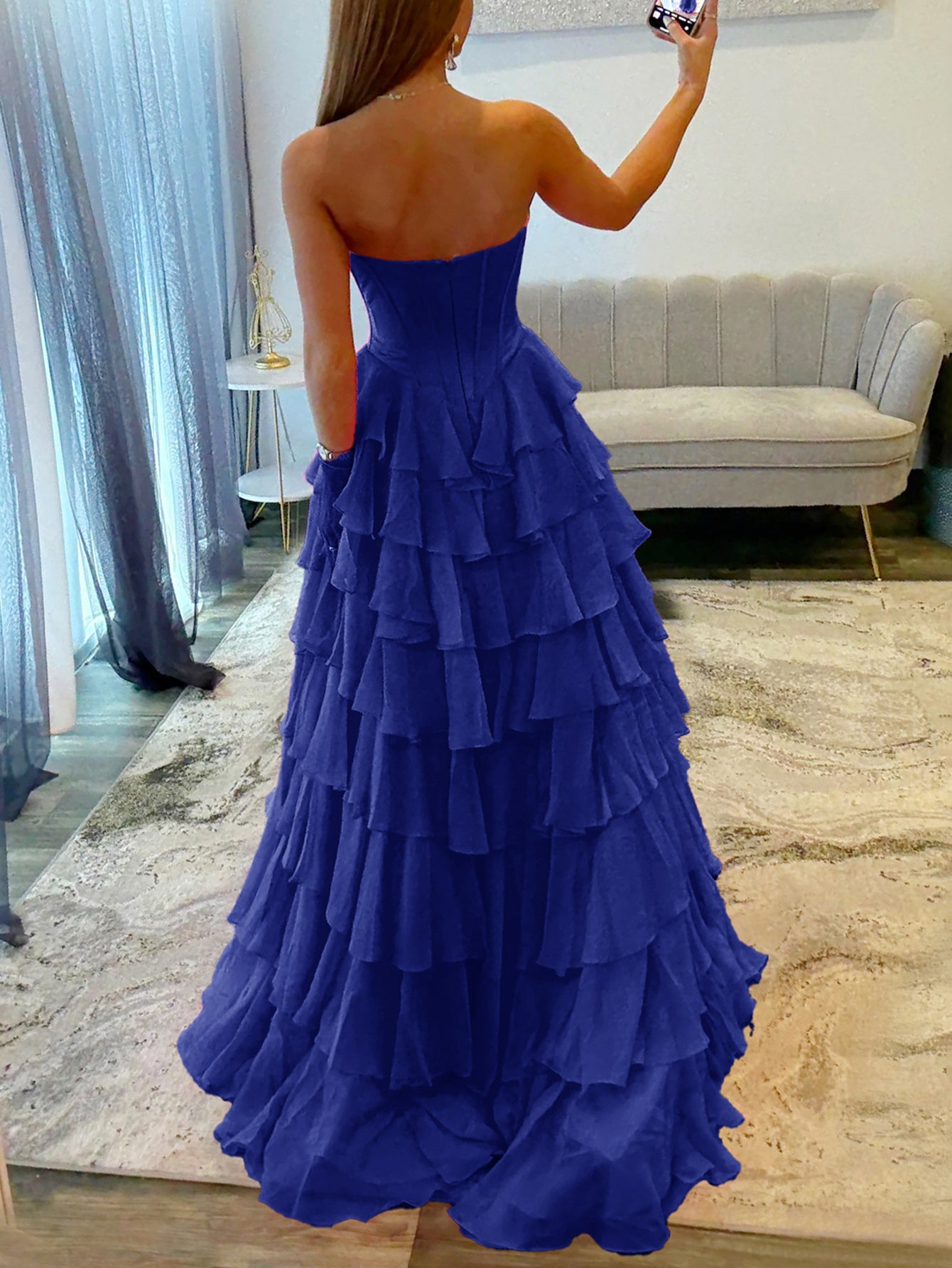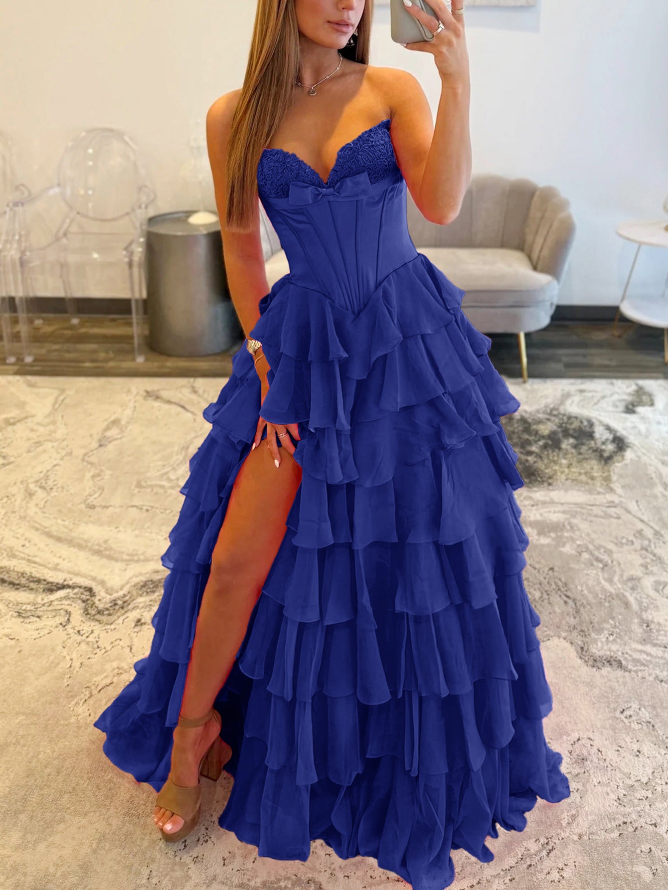 This chiffon prom gown features lace embroidery on the bodice. The strapless maxi dress has a sweetheart neckline and layered hem. This ball gown formal dress is ideal for party, evening or festivals.