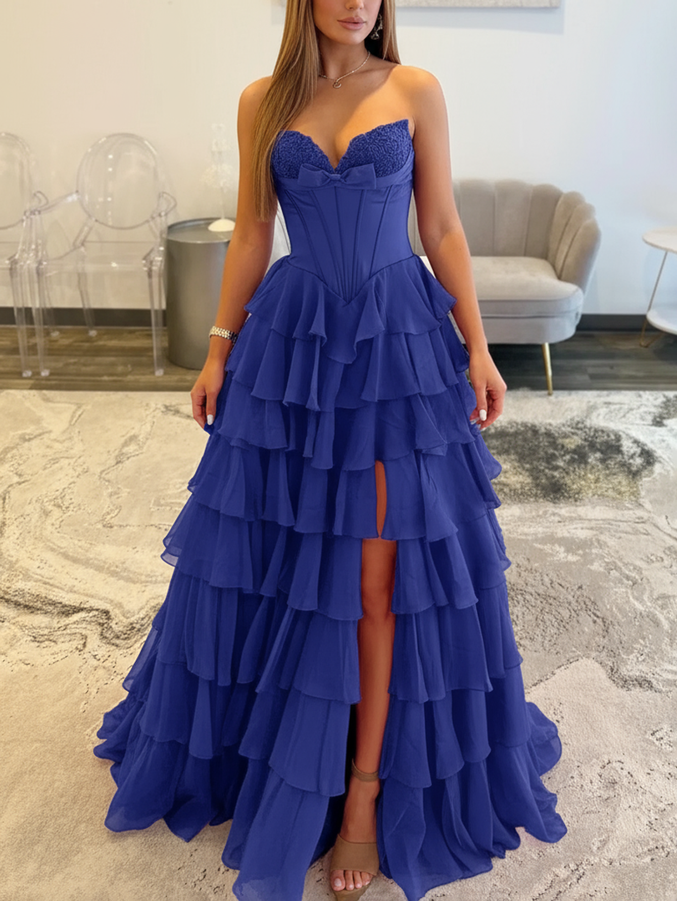 Lace Embroidery Boned Layered Ball Gown Prom Dress - Royal Blue