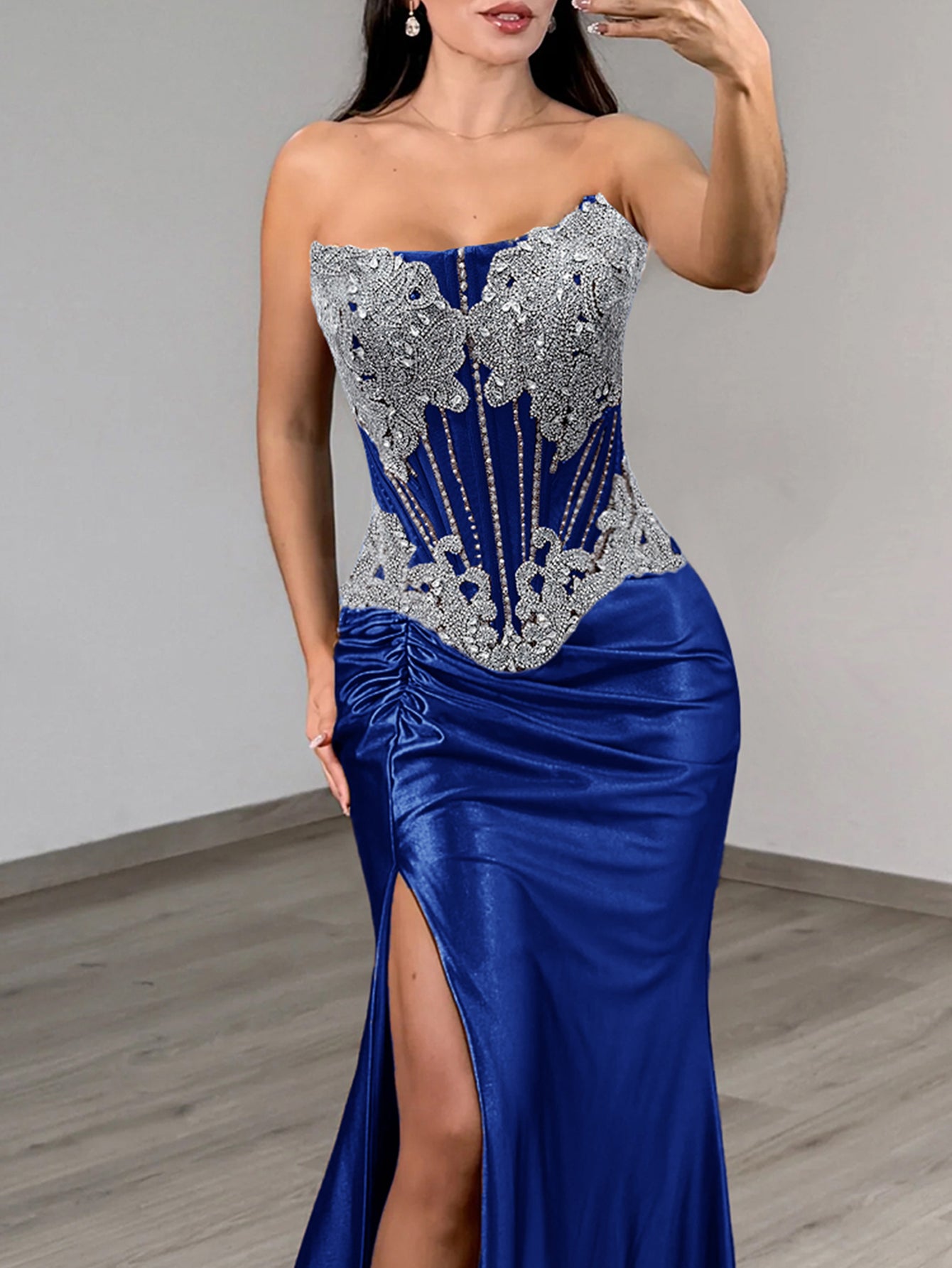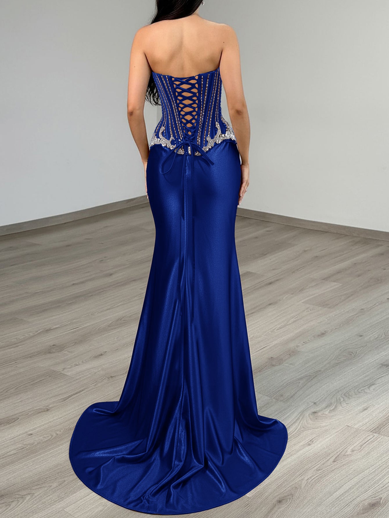 Luxury Crystal Strapless Sheer Bodice Mermaid Evening Dress - Royal Blue