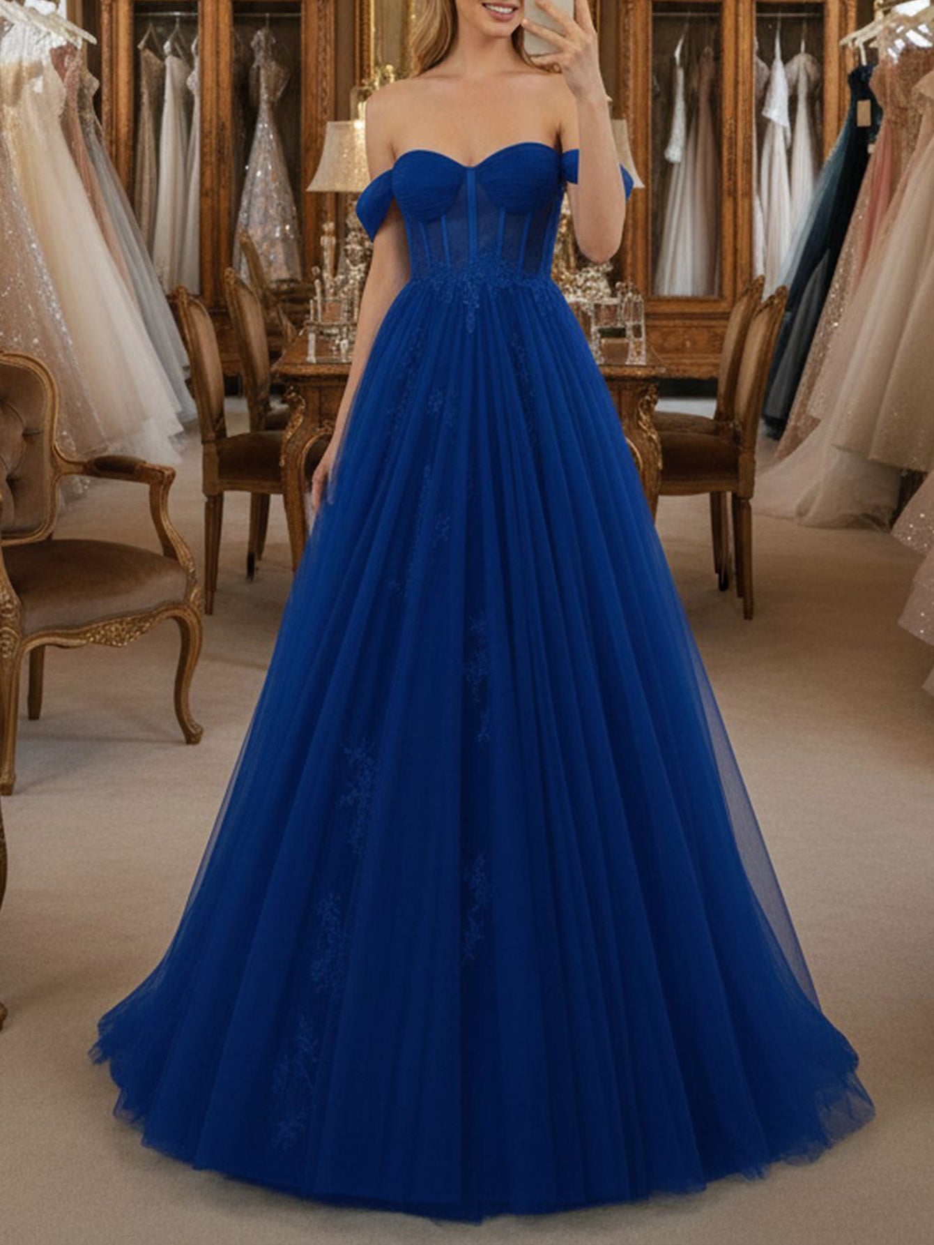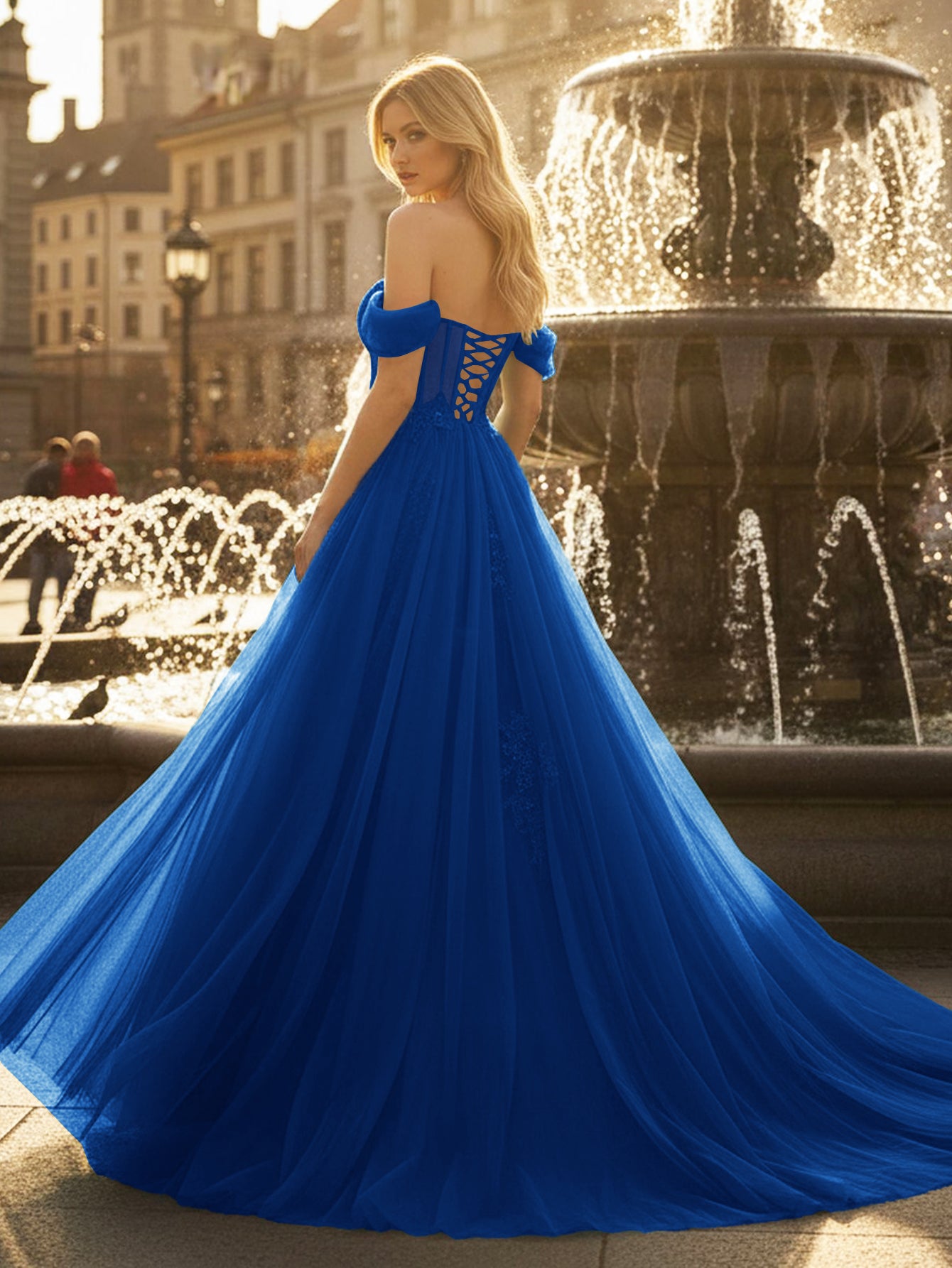 Off Shoulder Bodice Embroidery Lace Ball Gown Evening Dress - Royal Blue