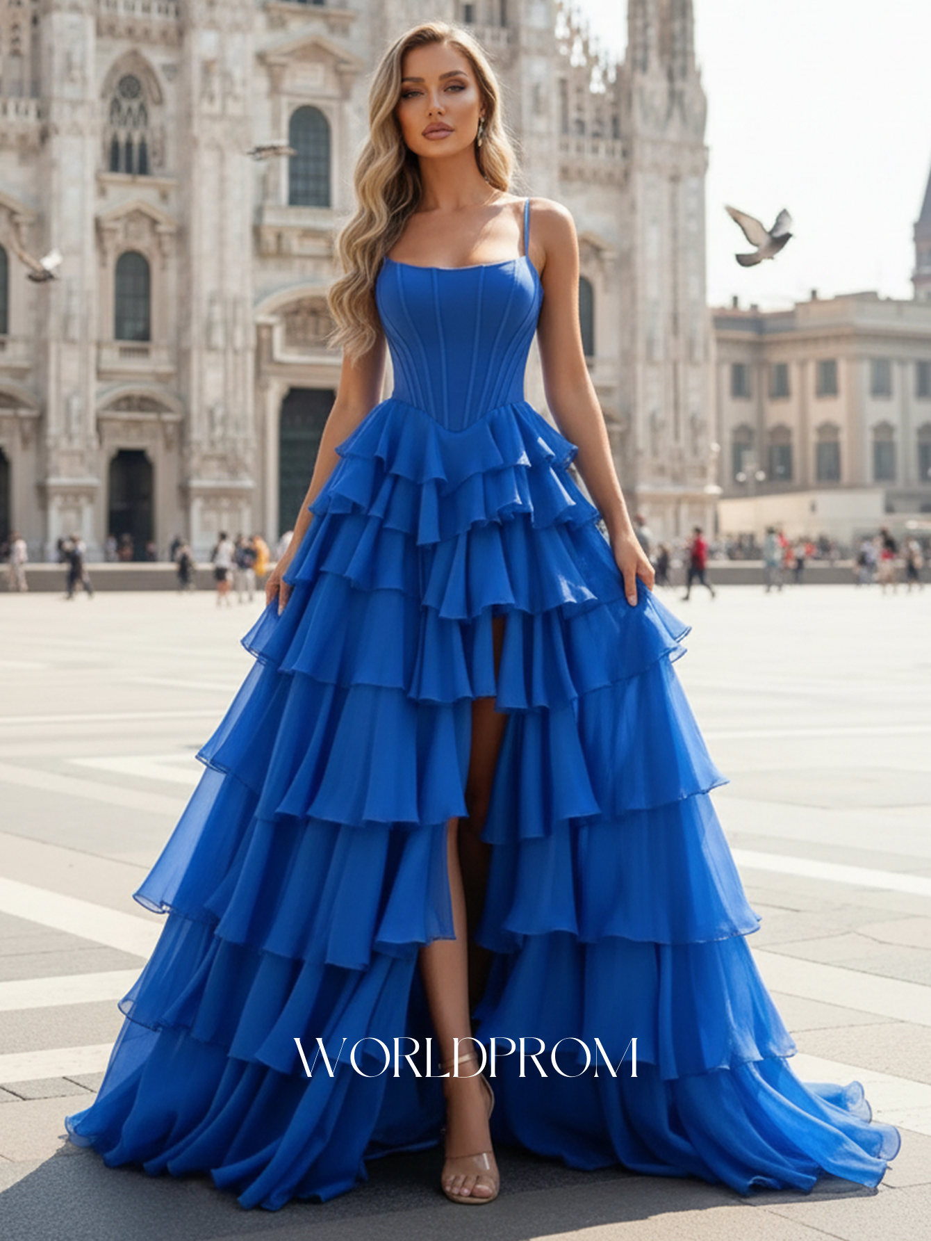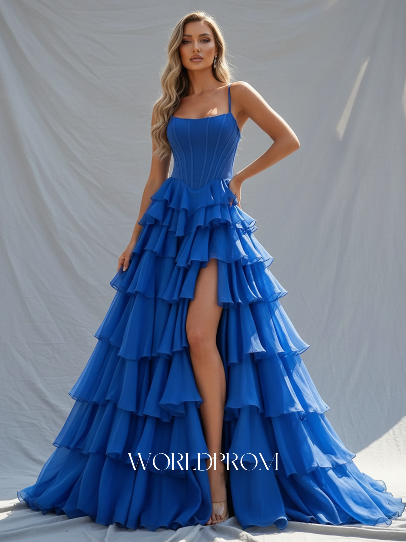 This chiffon prom gown features corset on the bodice. The lace up dress has a scoop neckline and layered hem with slit. Worldprom ball gown prom dresses are ideal for party, evening or festivals.