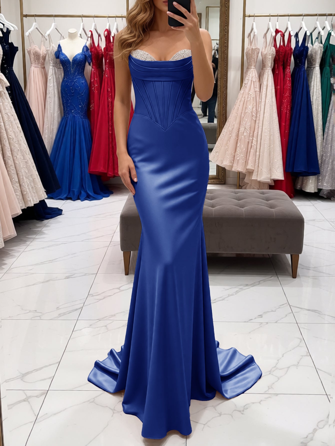 Sparkly Beading Bodice Long Mermaid Prom Dress With Removable Drop Train - Royal Blue