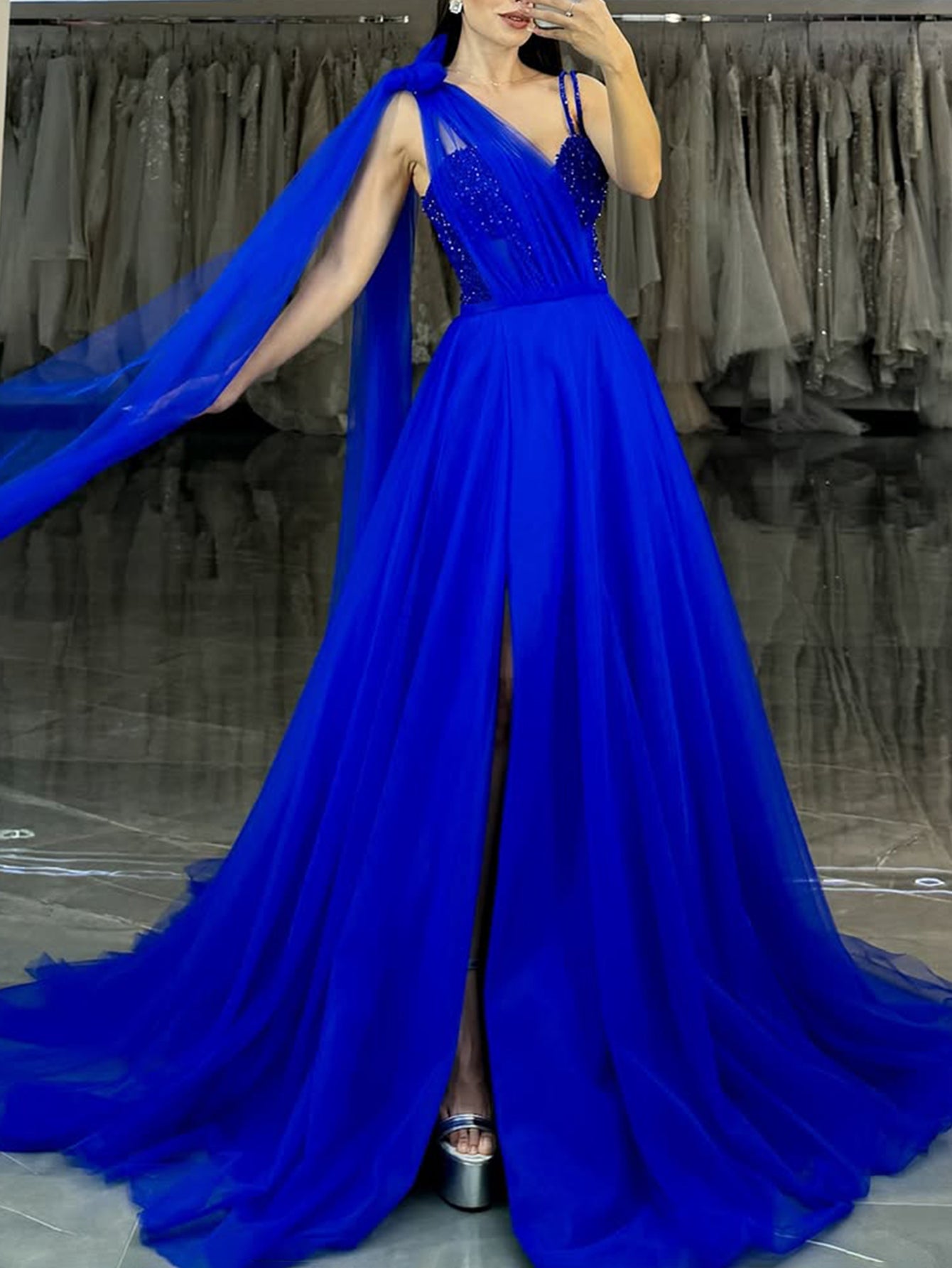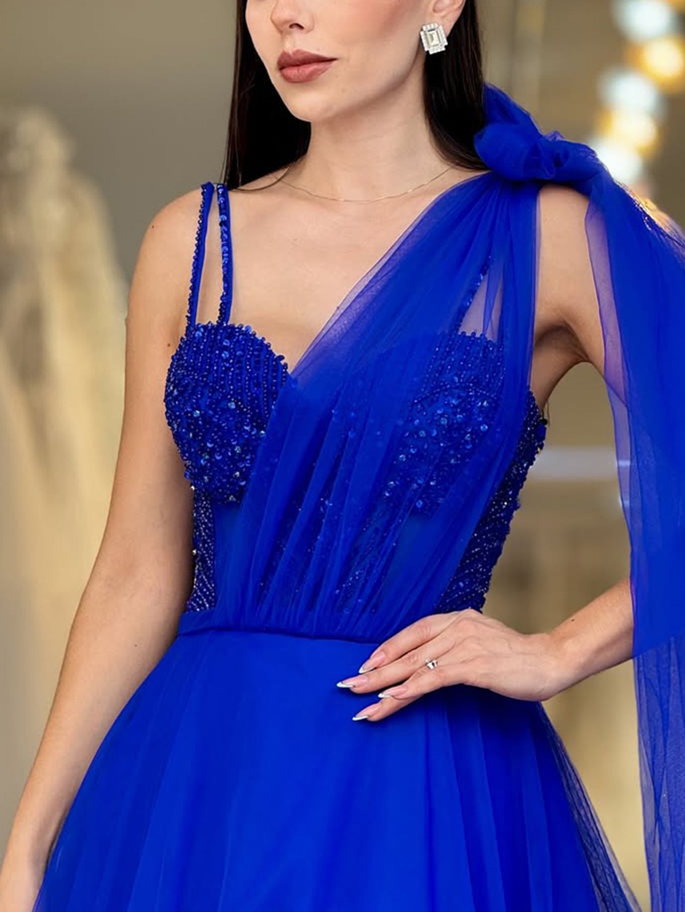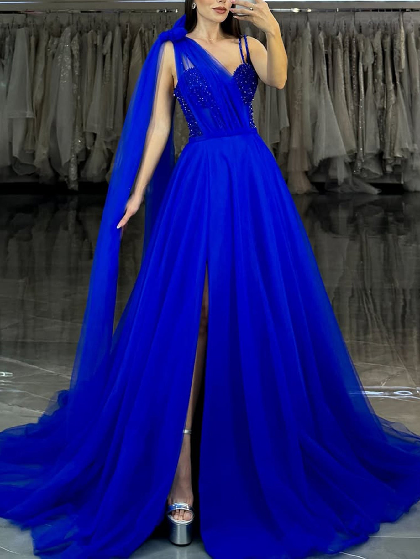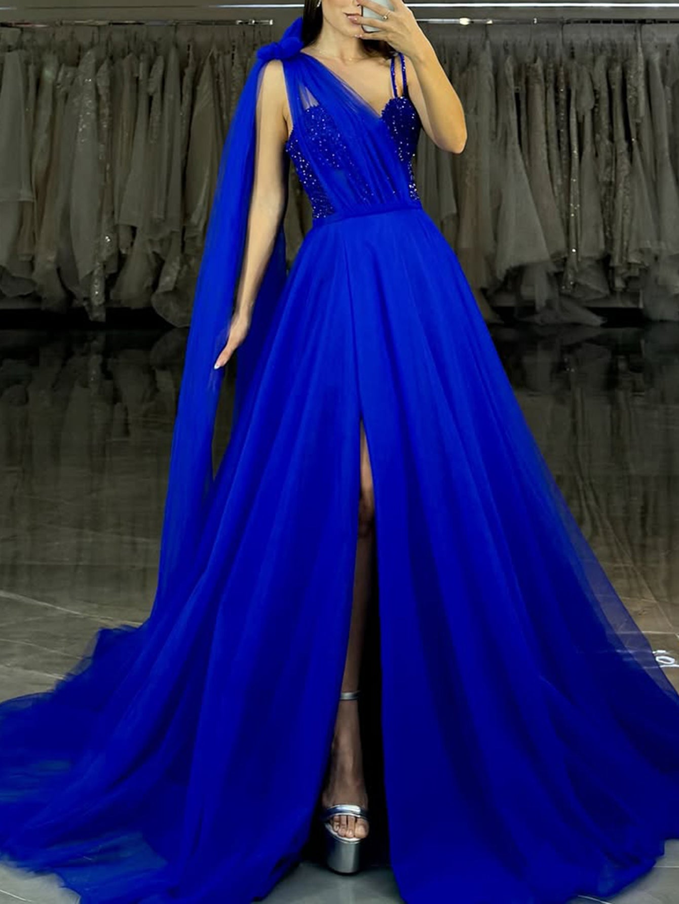 This tulle prom gown features hand beading with drop train on the bodice. The tank dress has a sweetheart neckline and pleated hem. Worldprom ball gown prom dresses are ideal for party, evening or festivals.
