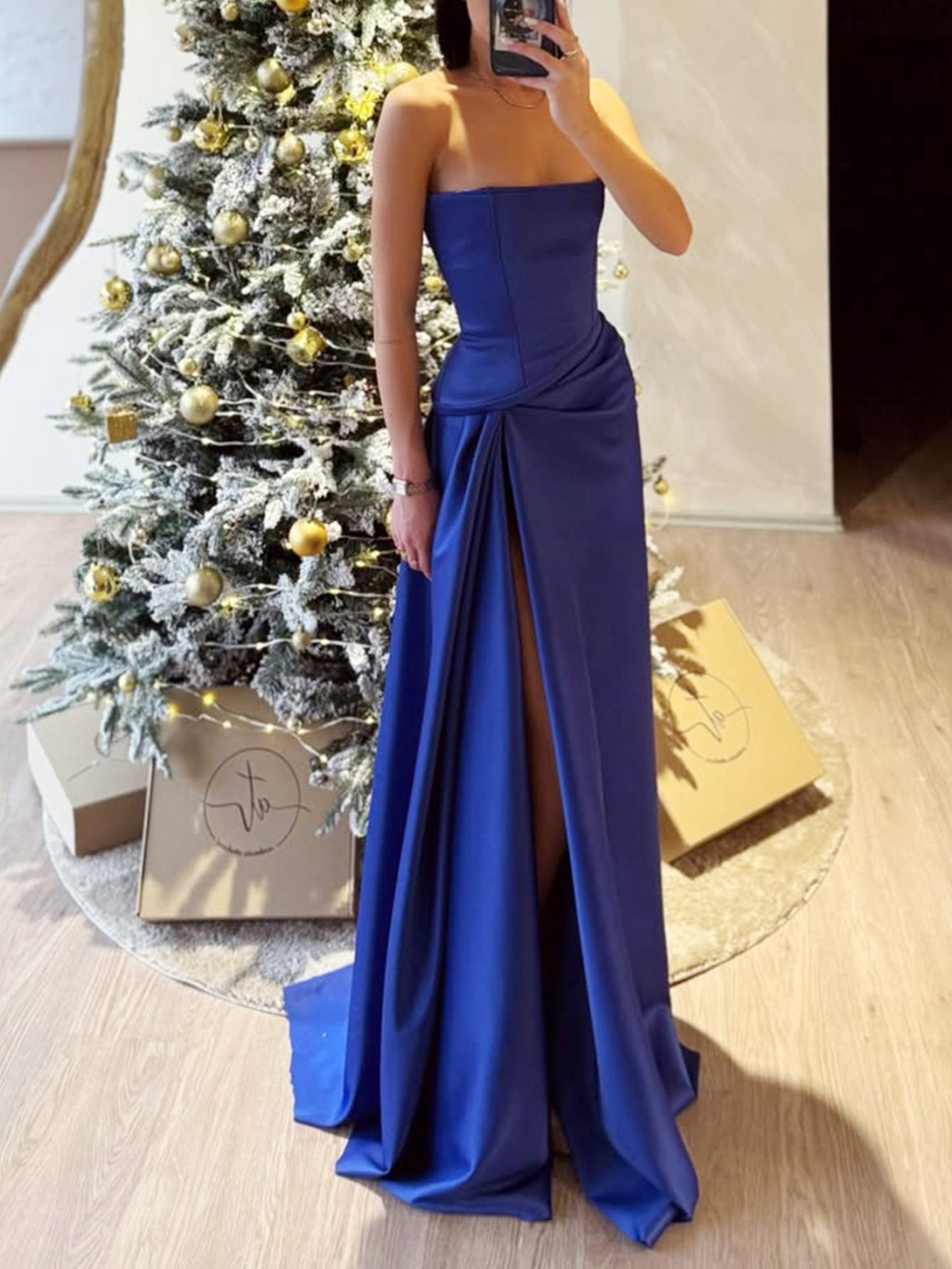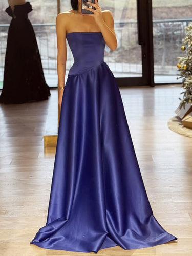 This satin prom dress features ruched waist on the bodice. The strapless ball gown dress has a pleated and split hem. Ruched dresses are ideal for party, evening or festivals.