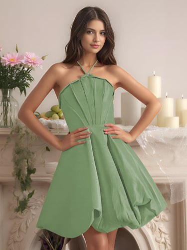 Puffy Boned Halter Bows Mini Ball Gown Prom Dress - Sage Green