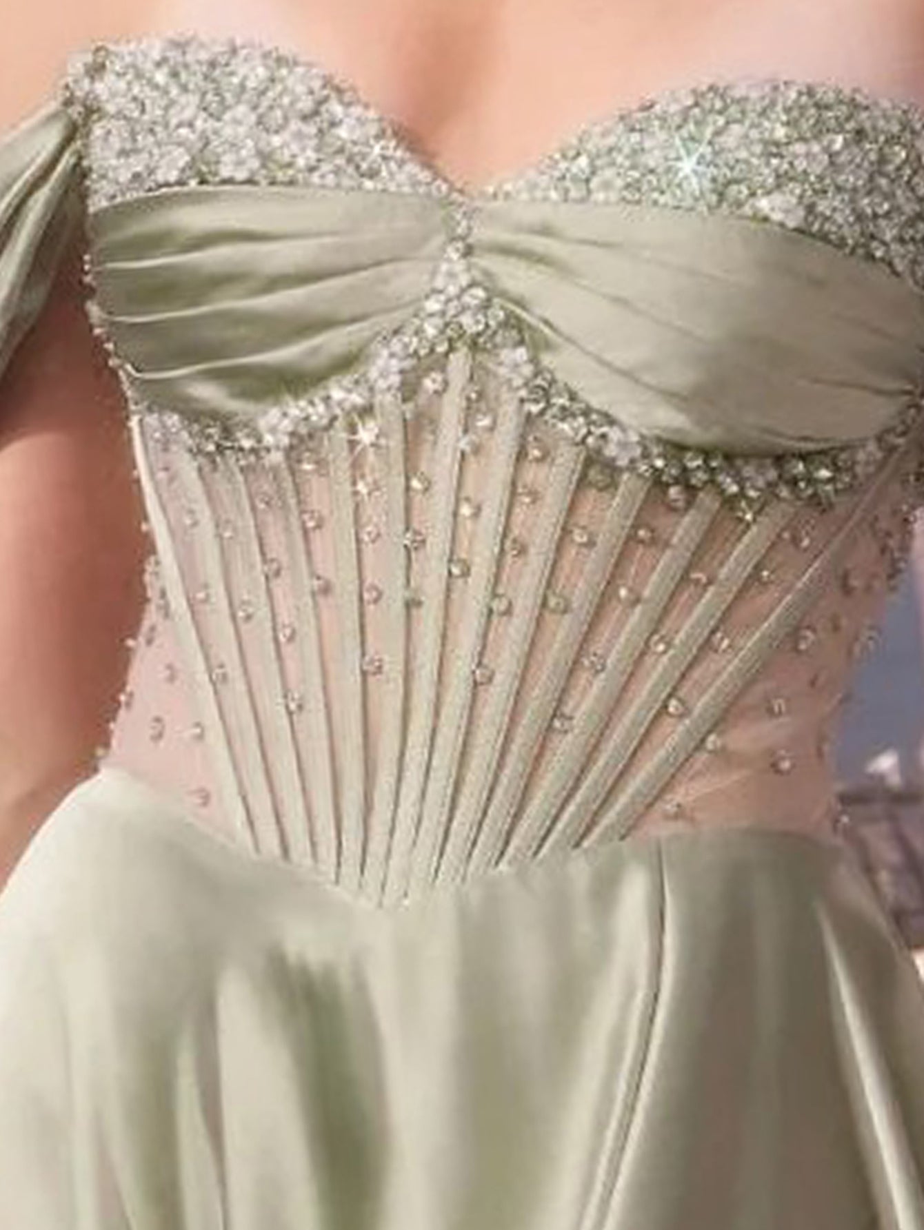 Beading Illusion Ruched Bodice Mermaid Prom Dress With Detachable Sleeves - Sage Green