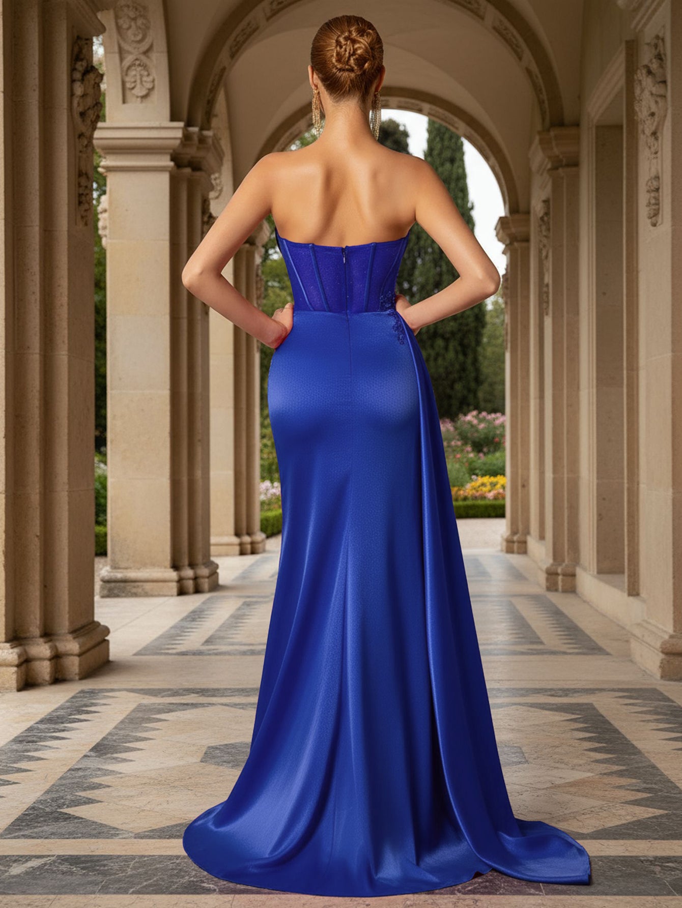 This satin prom gown features 3d rose on the illusion bodice. The strapless sexy evening dress has a sweetheart neckline and waist drop hem. This mermaid formal dress is ideal for party, evening or festivals.