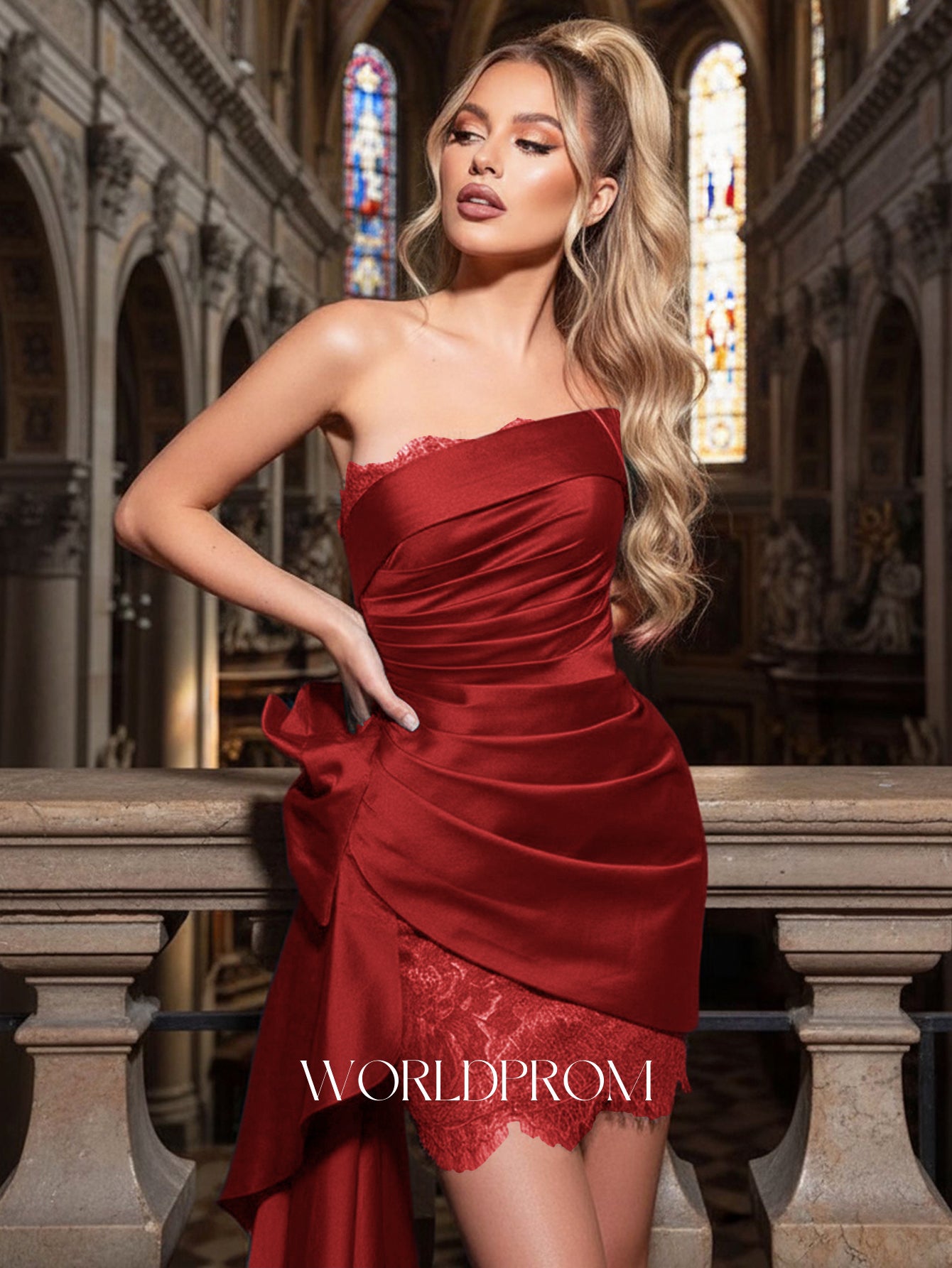 This luxury evening gown features drop train satin with big bow on the waist. The strapless luxury dress has a v-neck and wrap hem. This mini evening dress is ideal for party, evening or homecoming events.
