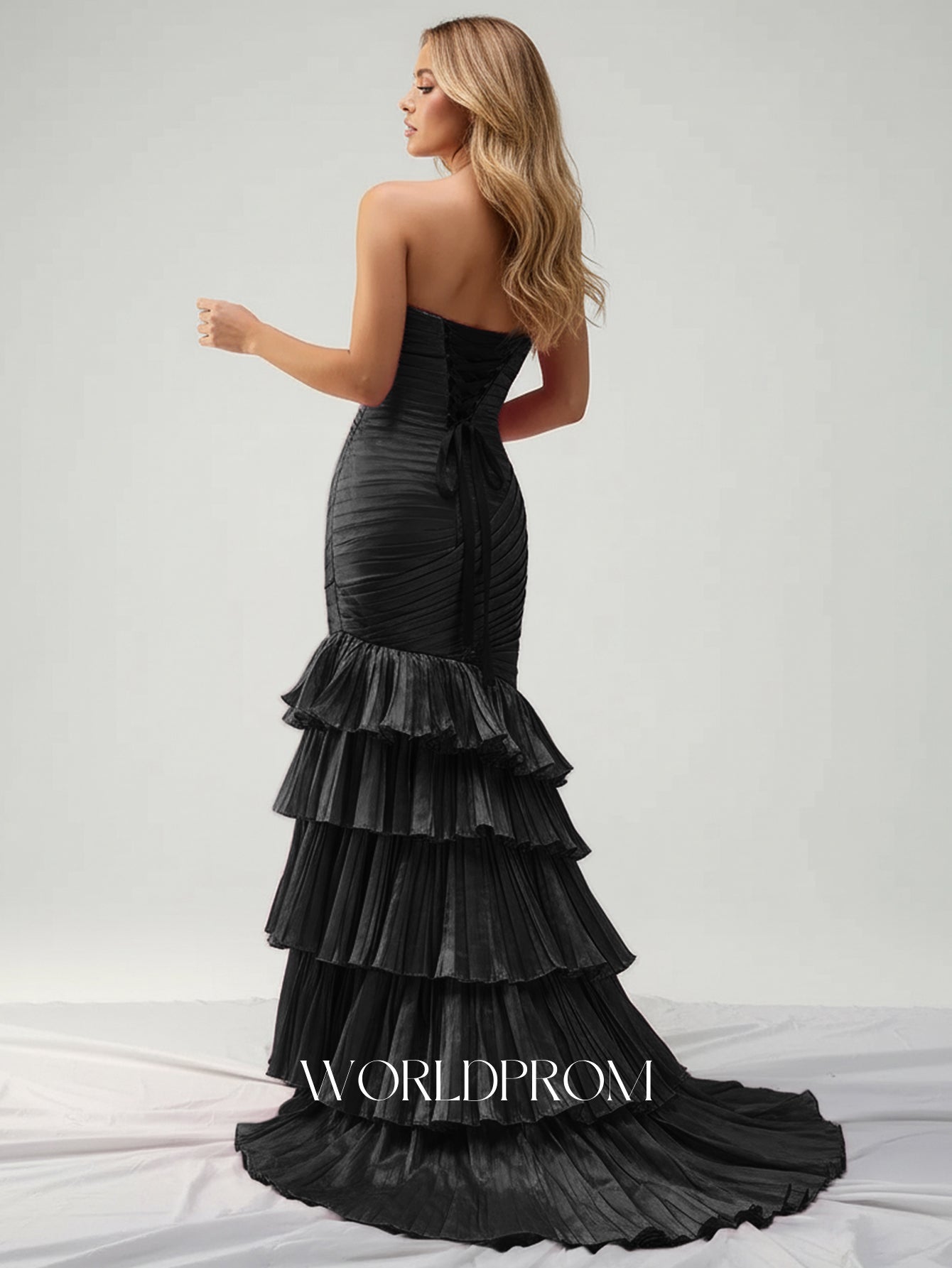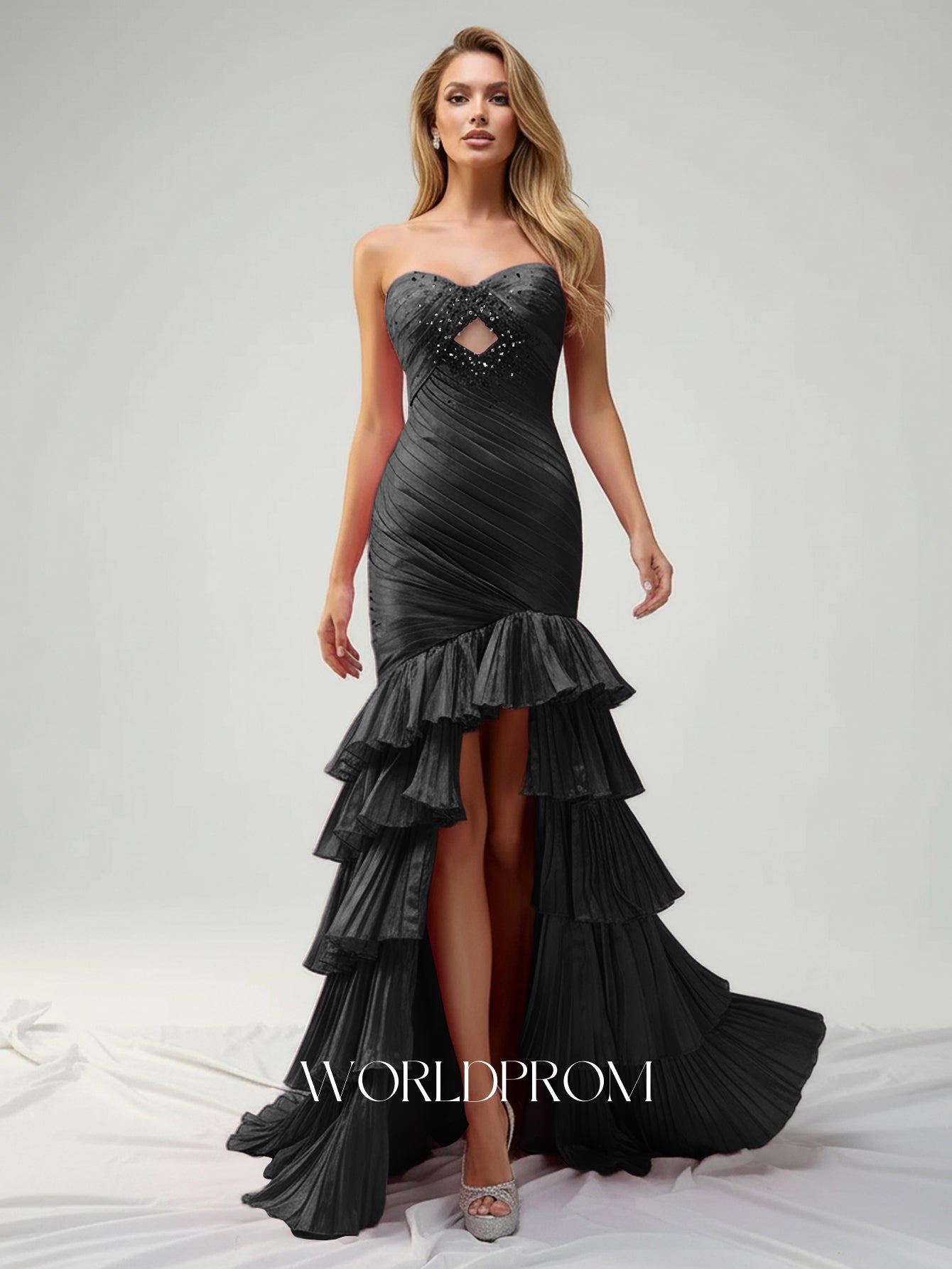 This satin prom gown features sparkly beading and cut front with bow back on the bodice. The strapless dress has a sweetheart neckline and ruffled pleated hem. Worldprom mermaid prom dresses are ideal for party, evening or festivals.