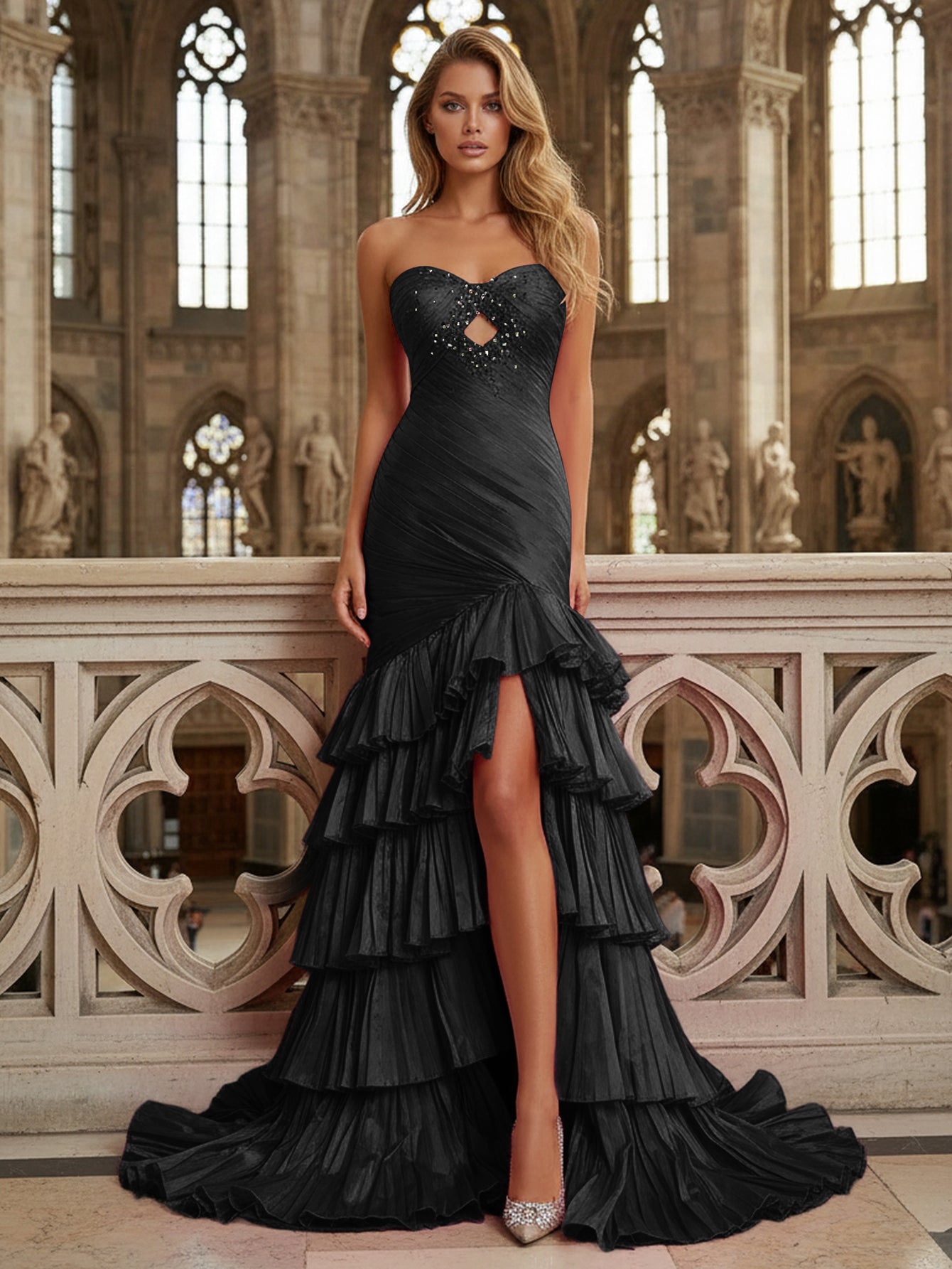 Details: Sparkly, Beading, Cut Front, Bow Back, Ruffled, Ruched, Pleated