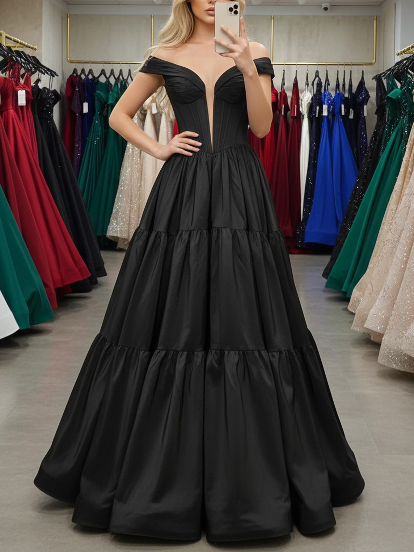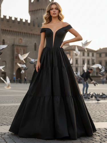 Deep V-Neck Off Shoulder Illusion Long Ball Gown Prom Dress - Black