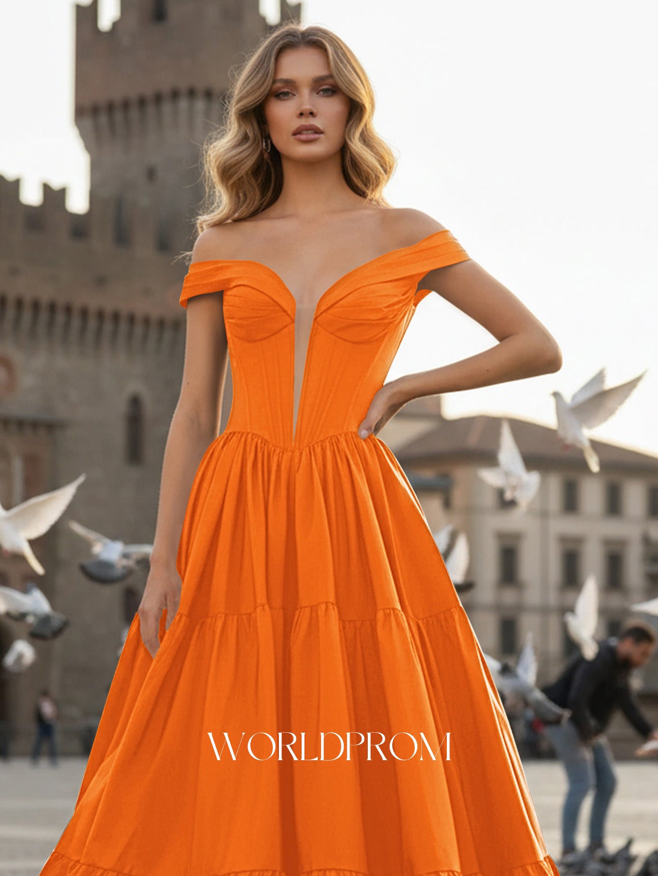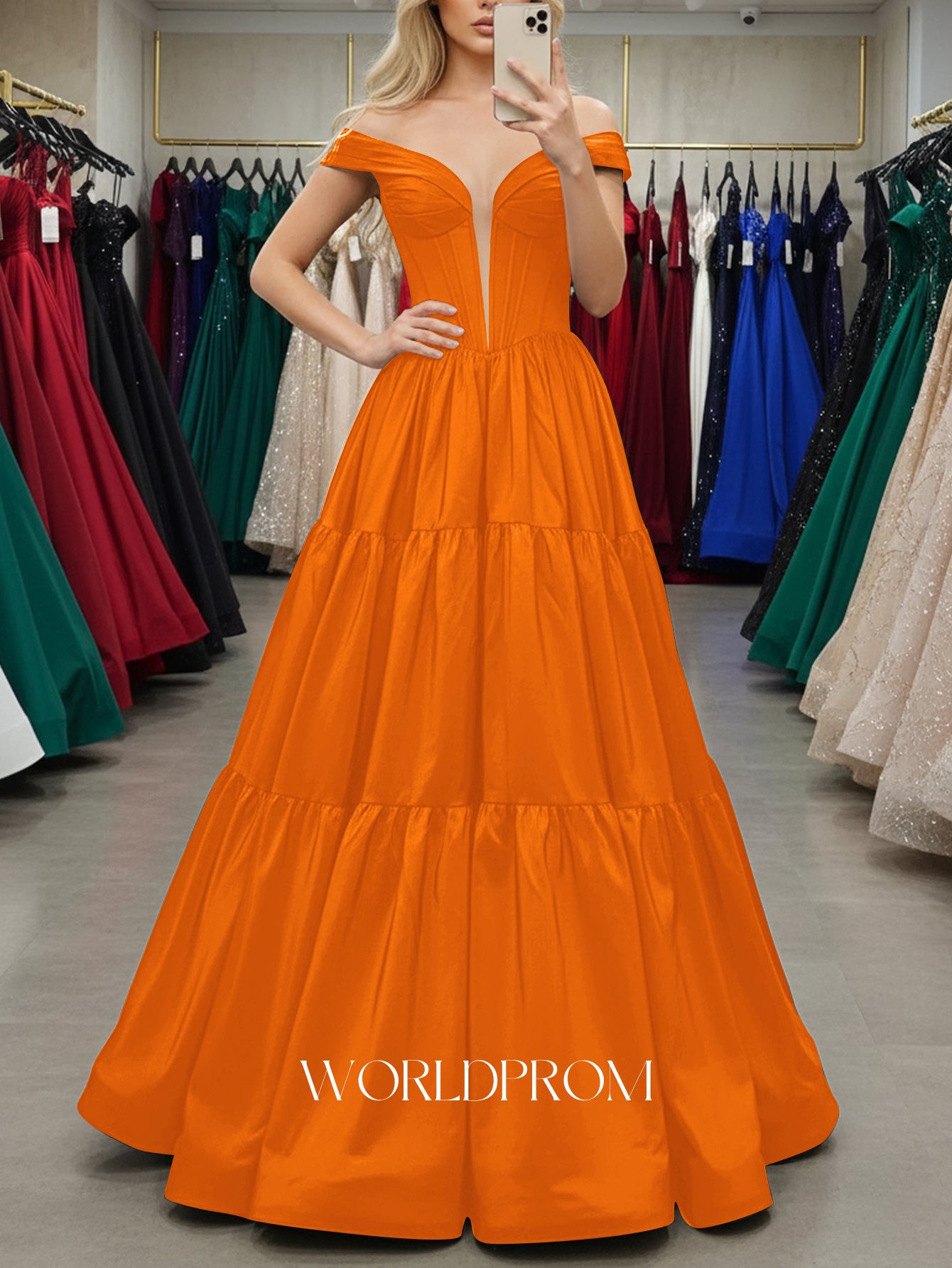 This satin prom gown features cut front on the bodice. The off shoulder maxi dress has a deep V-neckline and pleated hem. Worldprom ball gown prom dresses are ideal for party, evening or festivals.