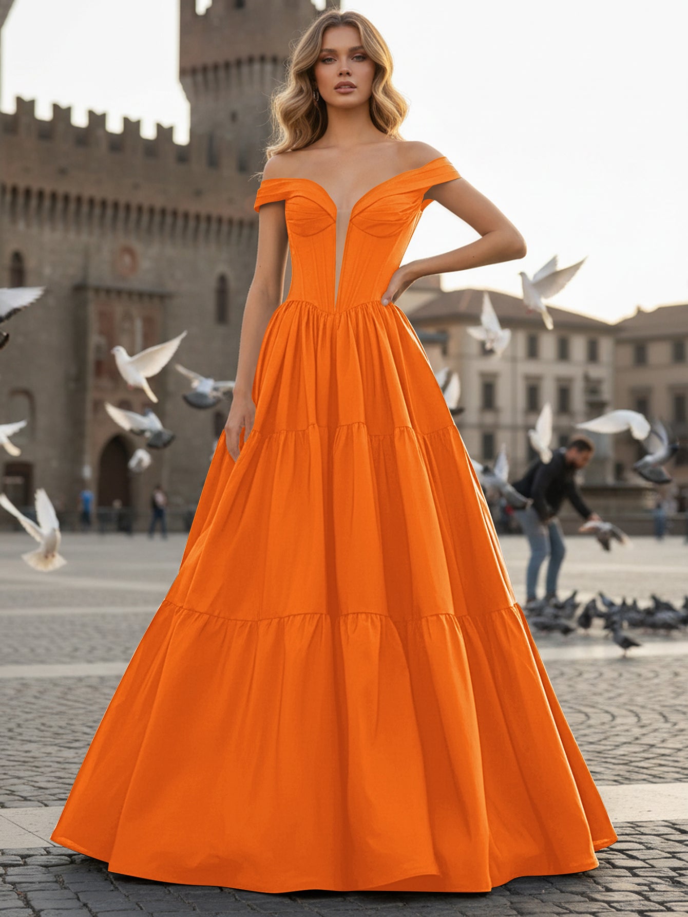 Deep V-Neck Off Shoulder Illusion Long Ball Gown Prom Dress - Orange