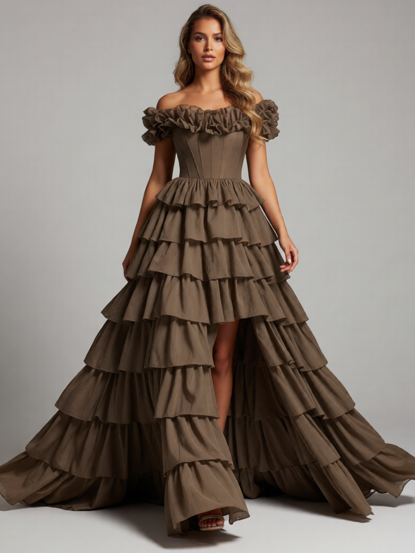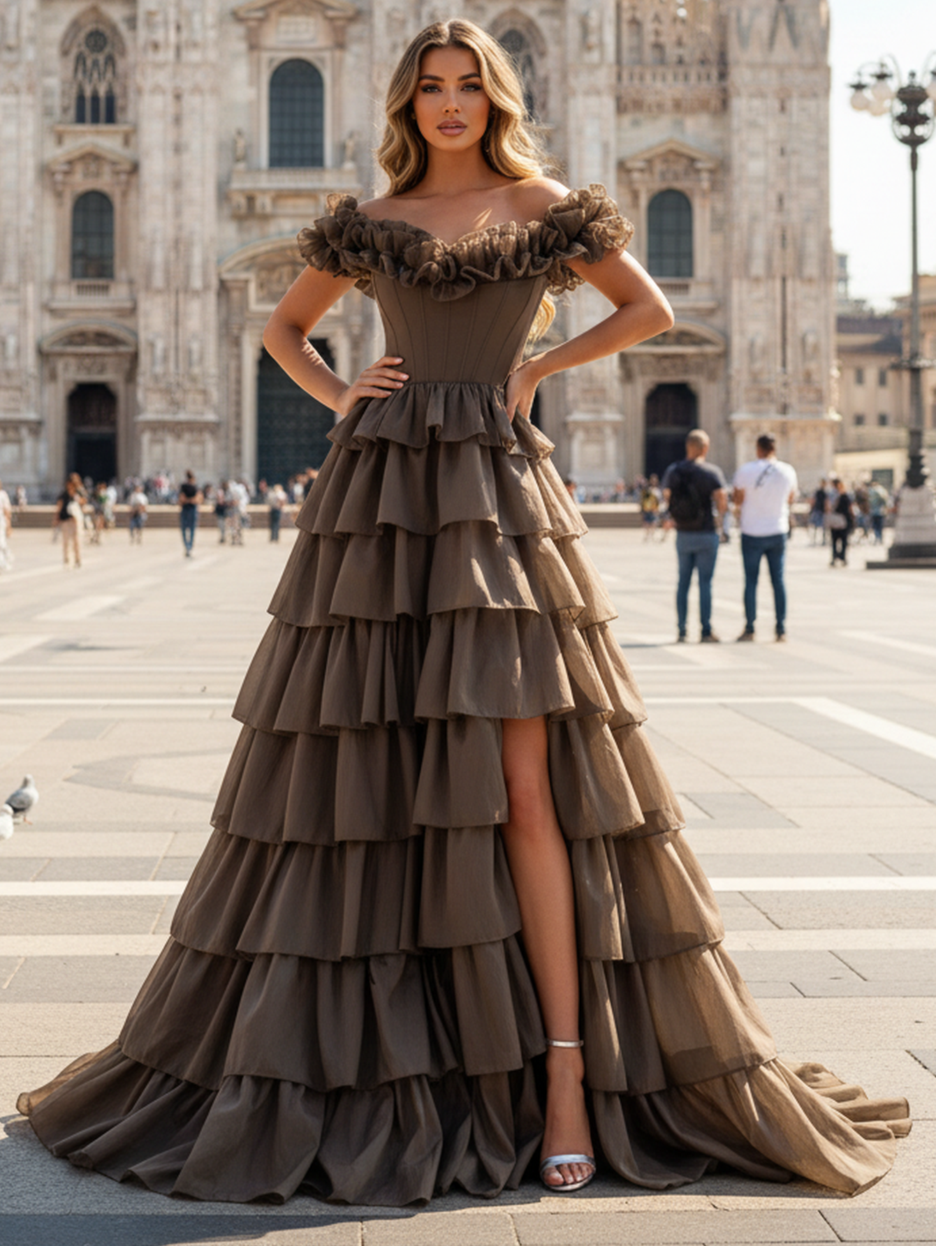 Off Shoulder Bodice Tiered Layered Ball Gown Prom Dress With Slit - Champagne Gold