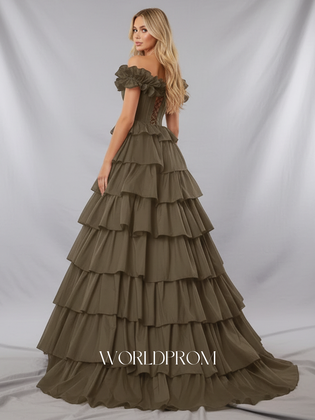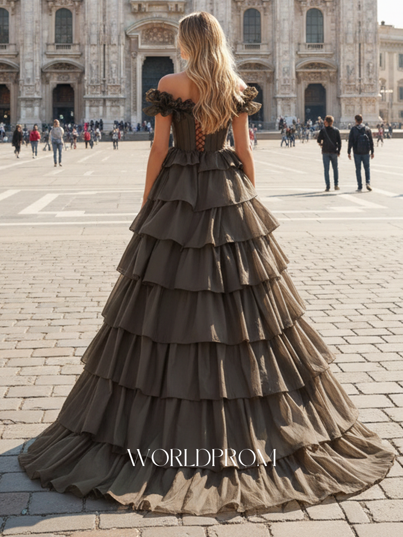 This satin prom dress features exaggerated shoulder on the bodice. The elegant dress for prom has a square neckline and ruffle tiered layered hem. This prom ball gown is ideal for party, evening, anniversary party, birthday party, cocktail, graduation party or homecoming events.