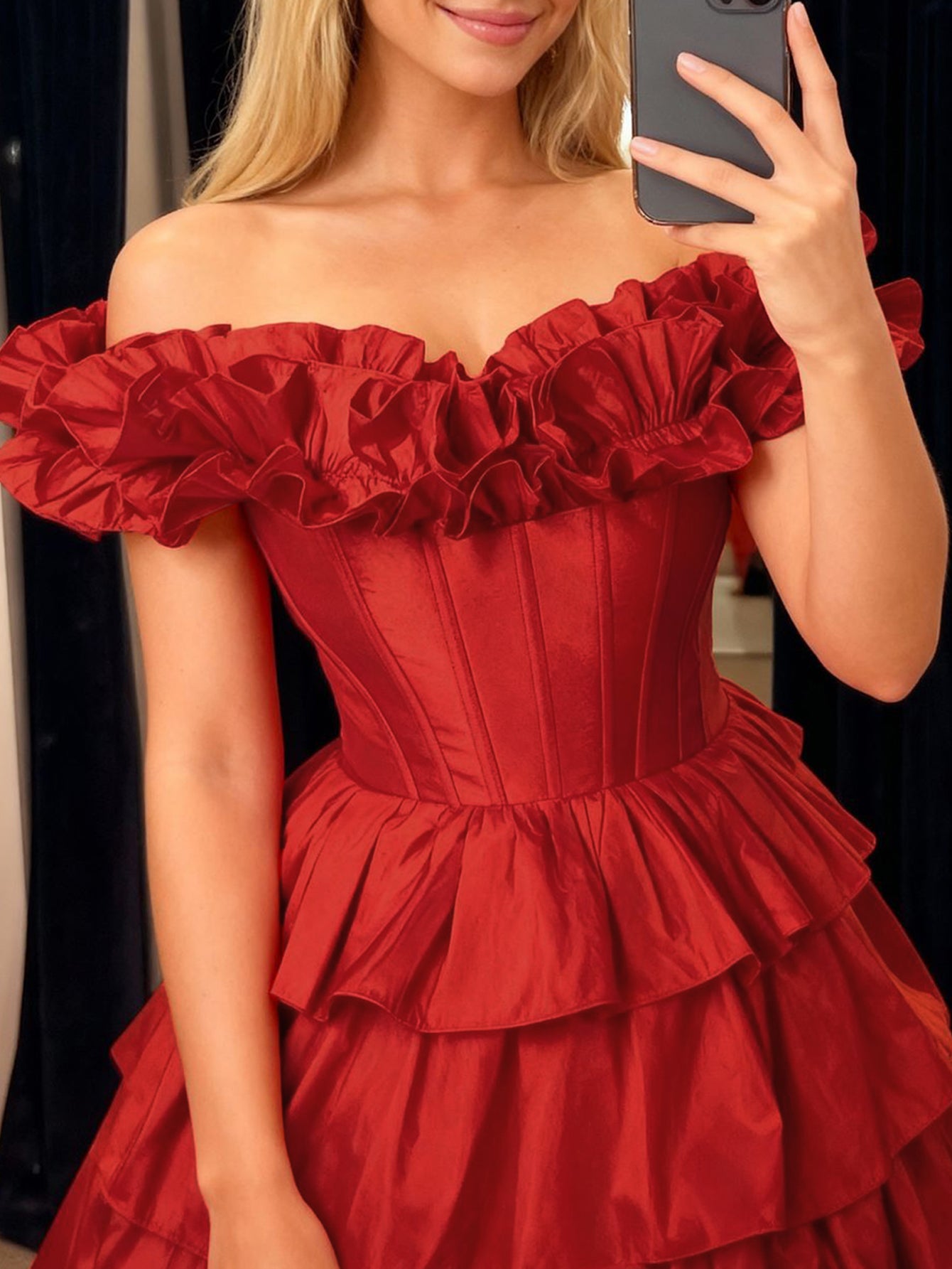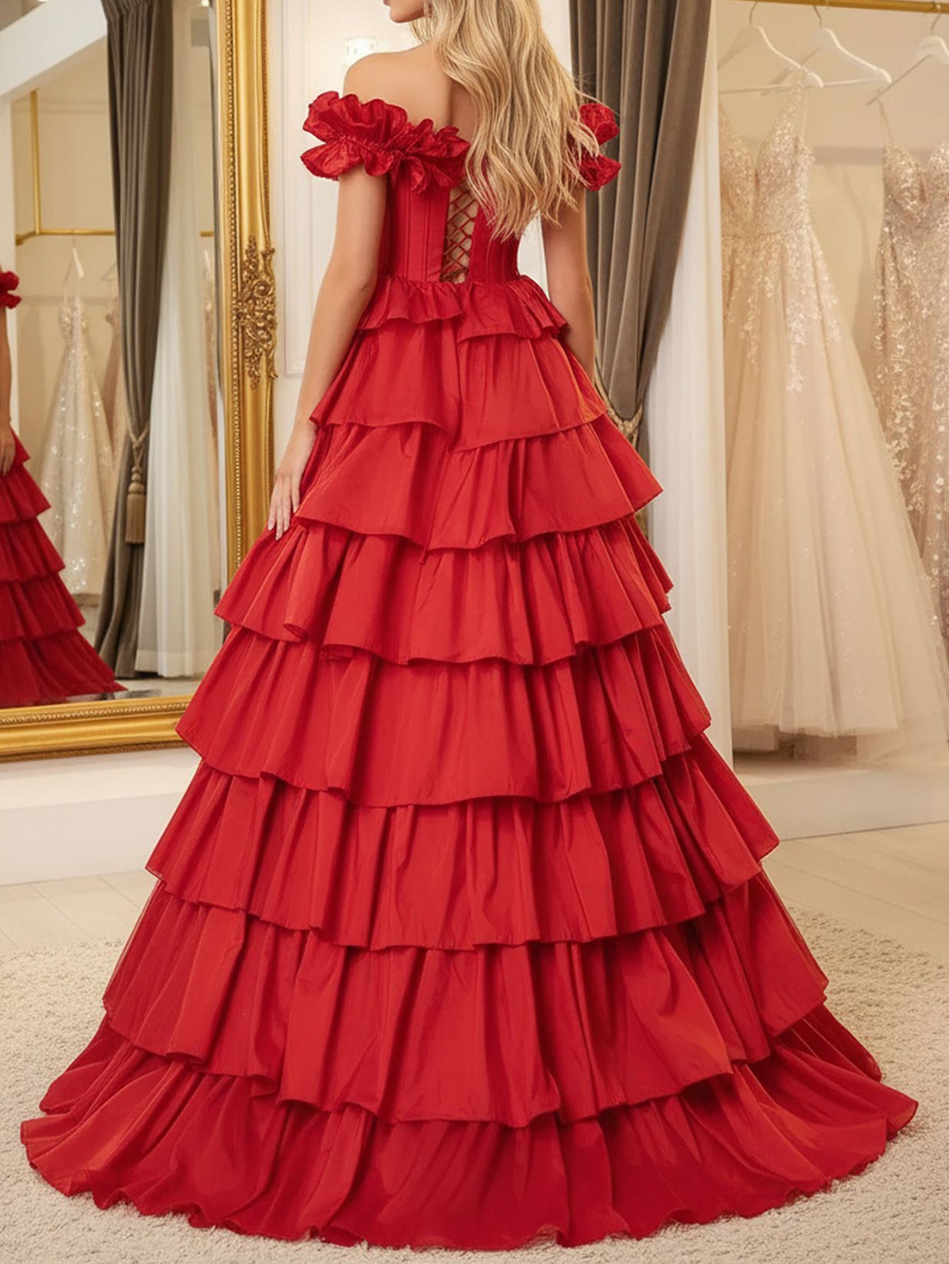 This satin prom dress features exaggerated shoulder on the bodice. The elegant dress for prom has a square neckline and ruffle tiered layered hem. This red prom ball gown is ideal for party, evening, anniversary party, birthday party, cocktail, graduation party or homecoming events.