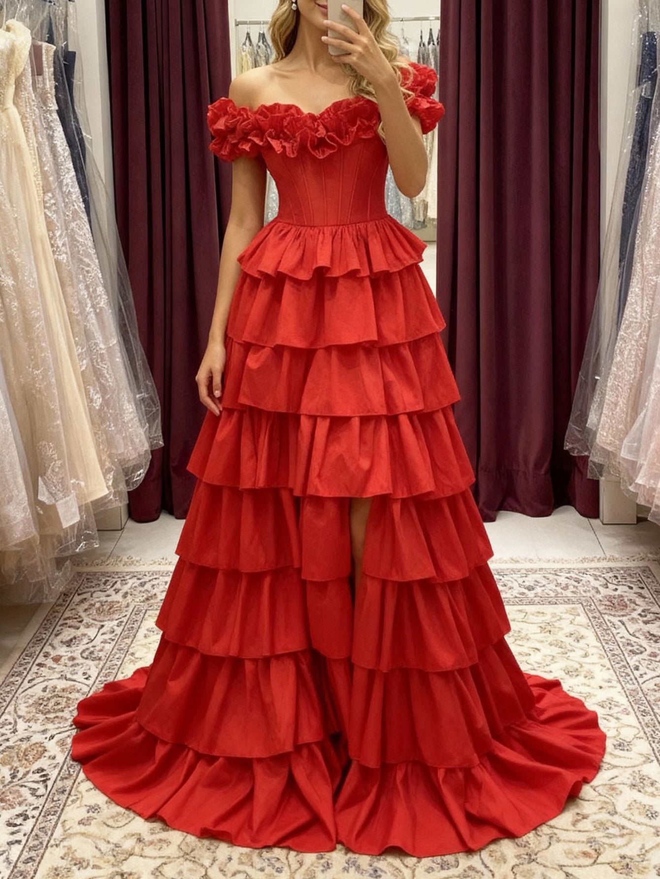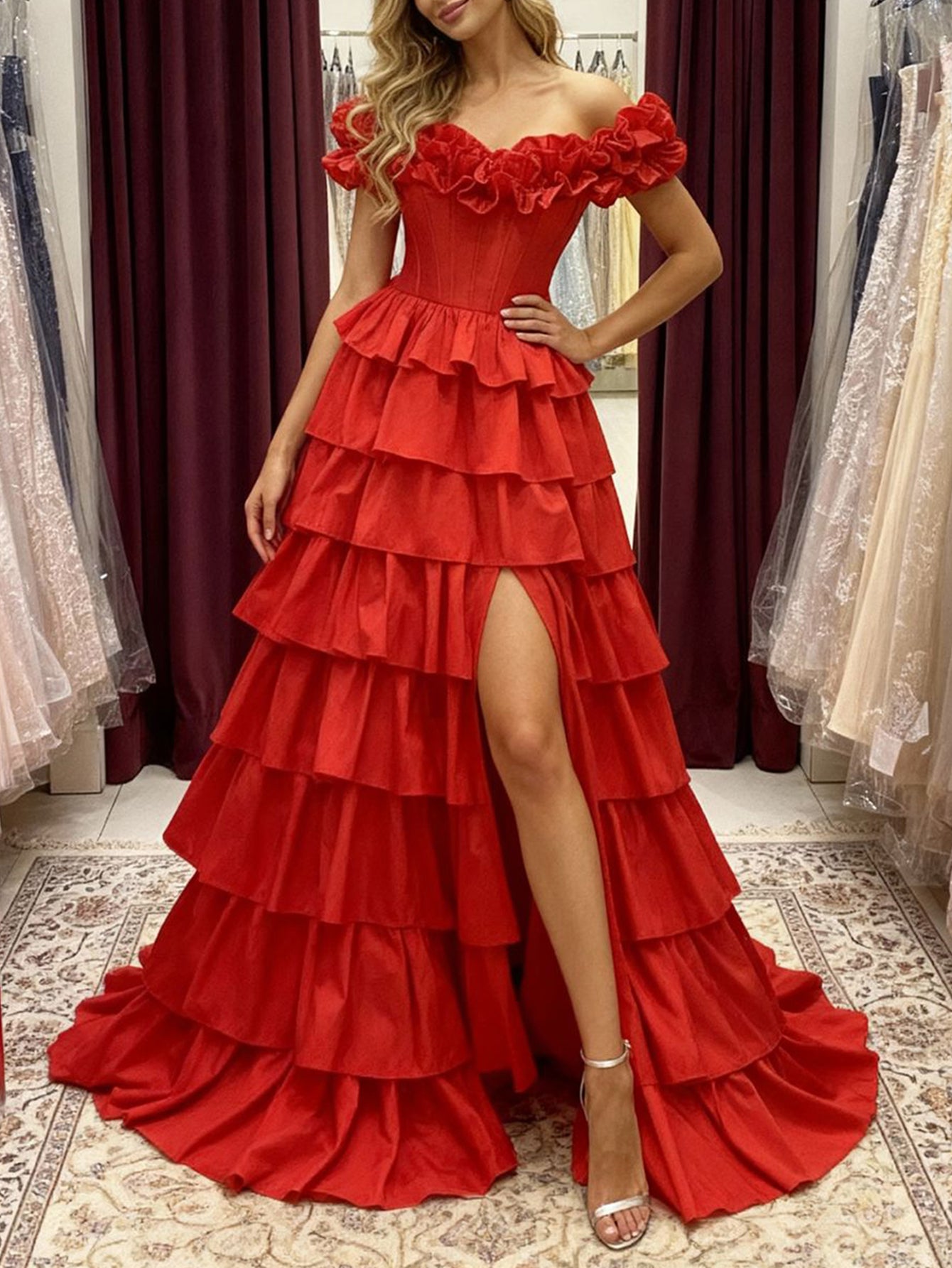 Off Shoulder Bodice Tiered Layered Ball Gown Prom Dress With Slit - Red