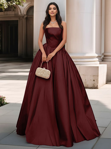 Pleated Bust Ruffle Hem Strapless Satin Prom Ball Gown - Burgundy