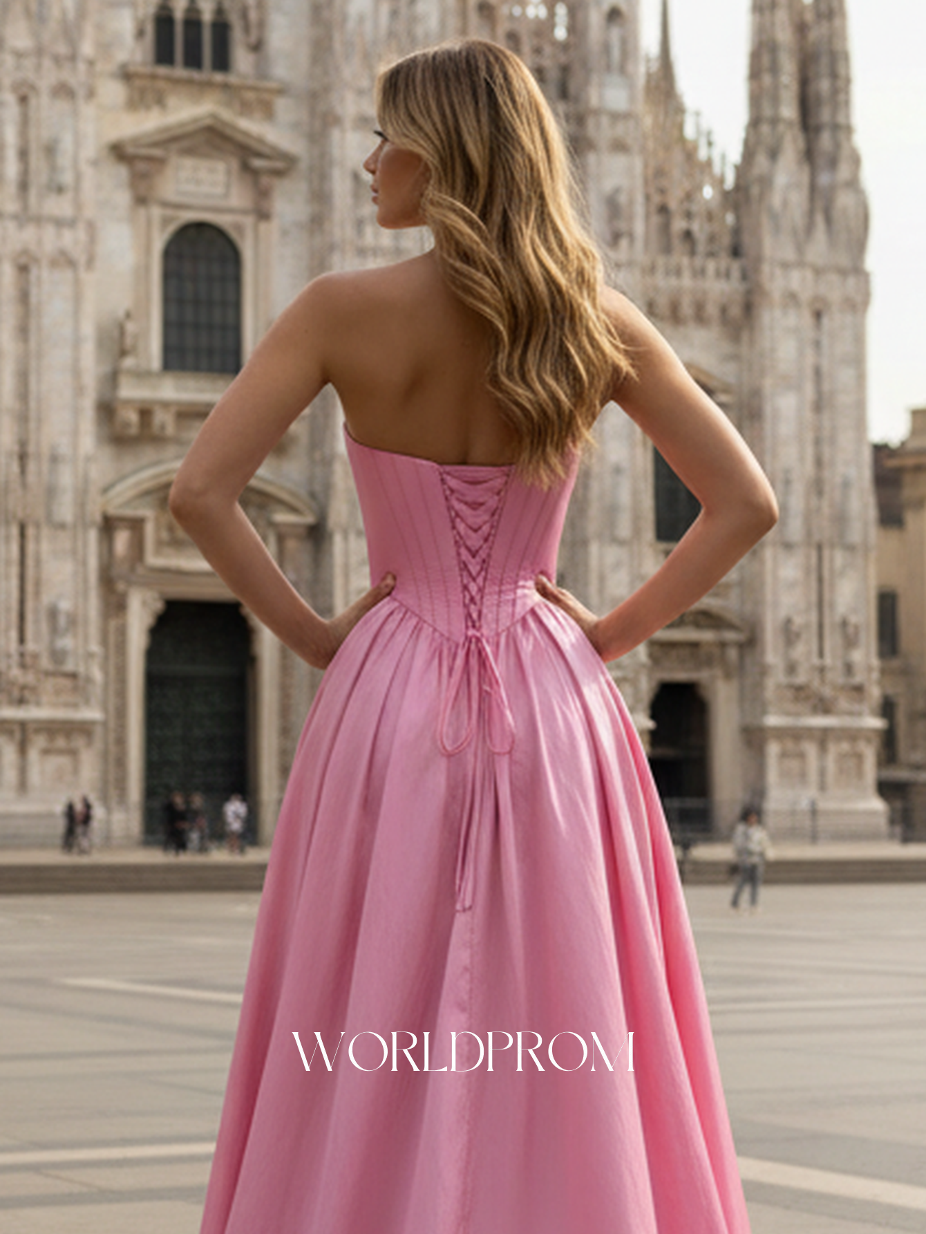 This satin prom gown features ruched bust on the bodice. The strapless dress has a scoop neckline and pleated split hem. Worldprom a-line prom dresses are ideal for party, evening or festivals.