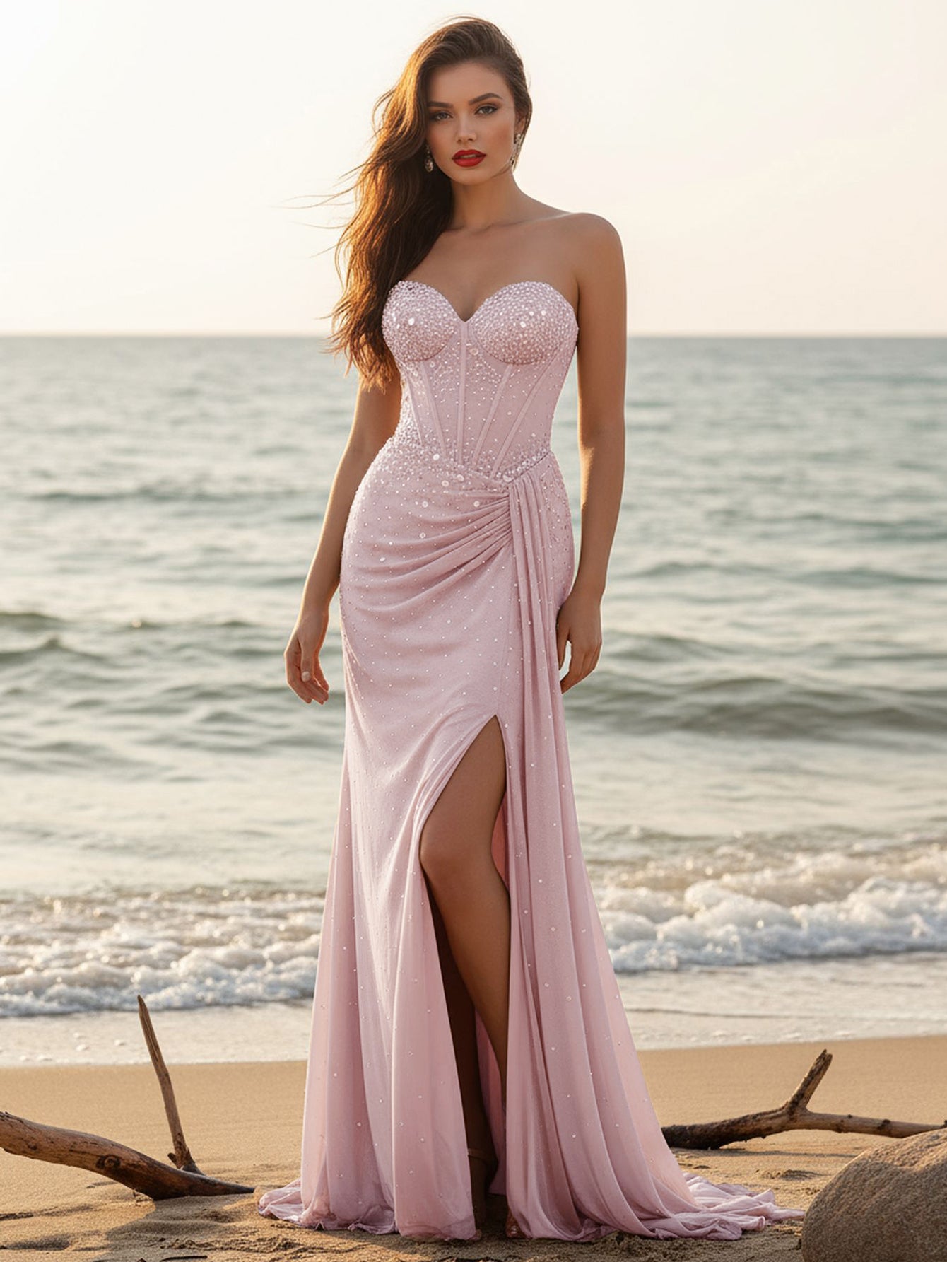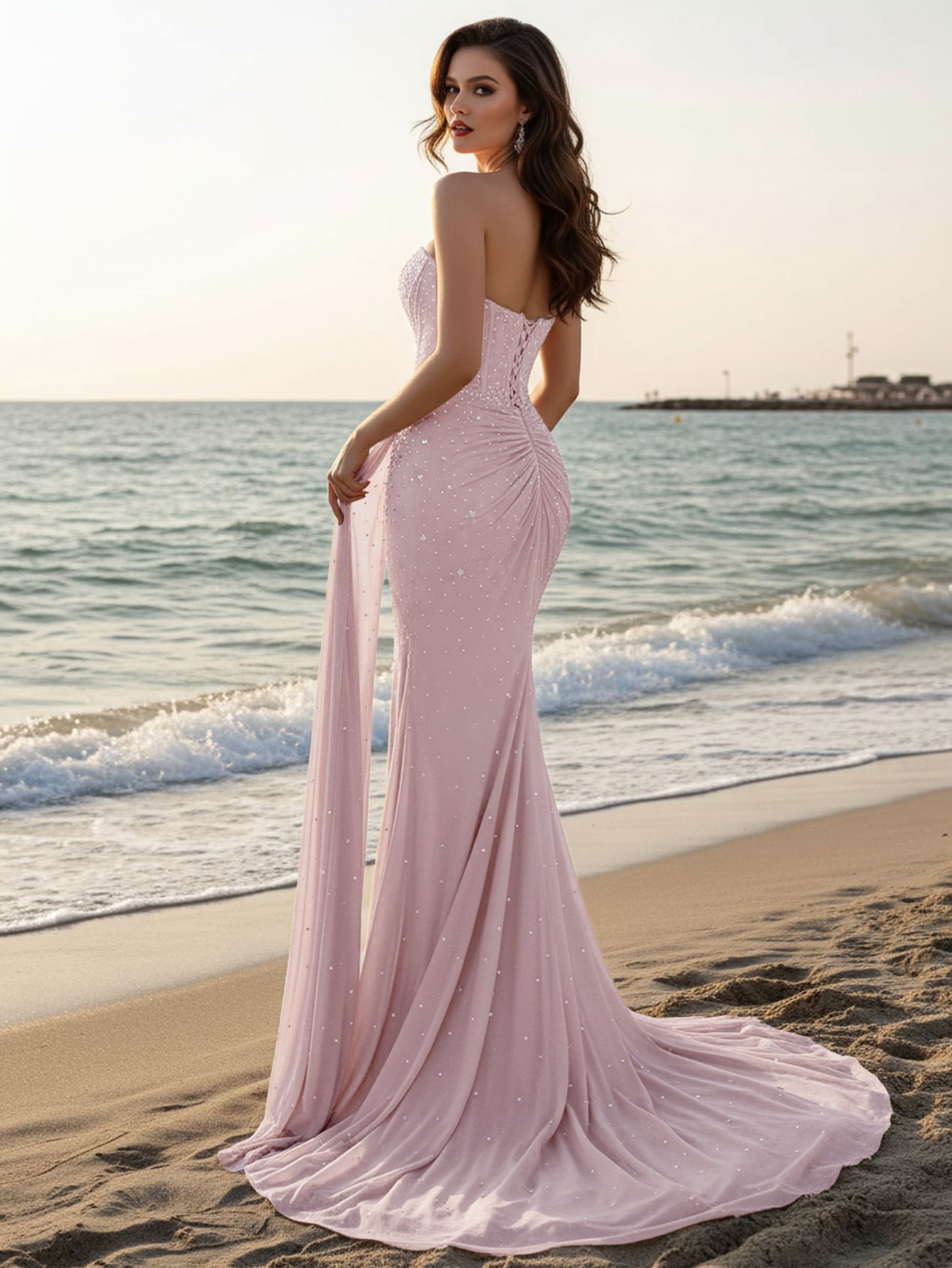 Strapless Beading Ruched Illusion Bodice Mermaid Prom Dress With Drop - Light Pink