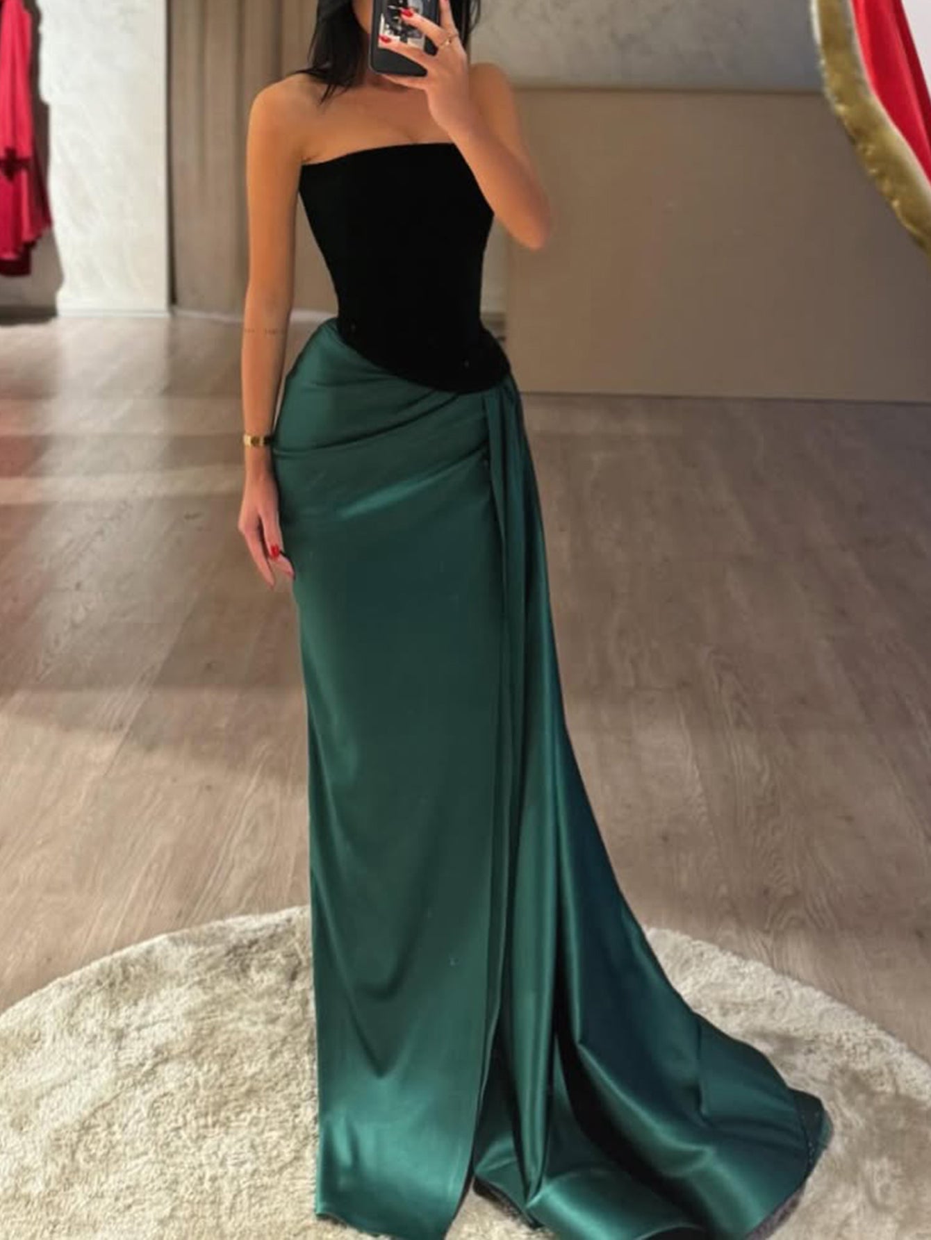 This satin prom gown features corset bust with drop train on the bodice. The strapless ruched dress has a scoop neckline and split hem. Worldprom mermaid prom dresses are ideal for party, evening or festivals.