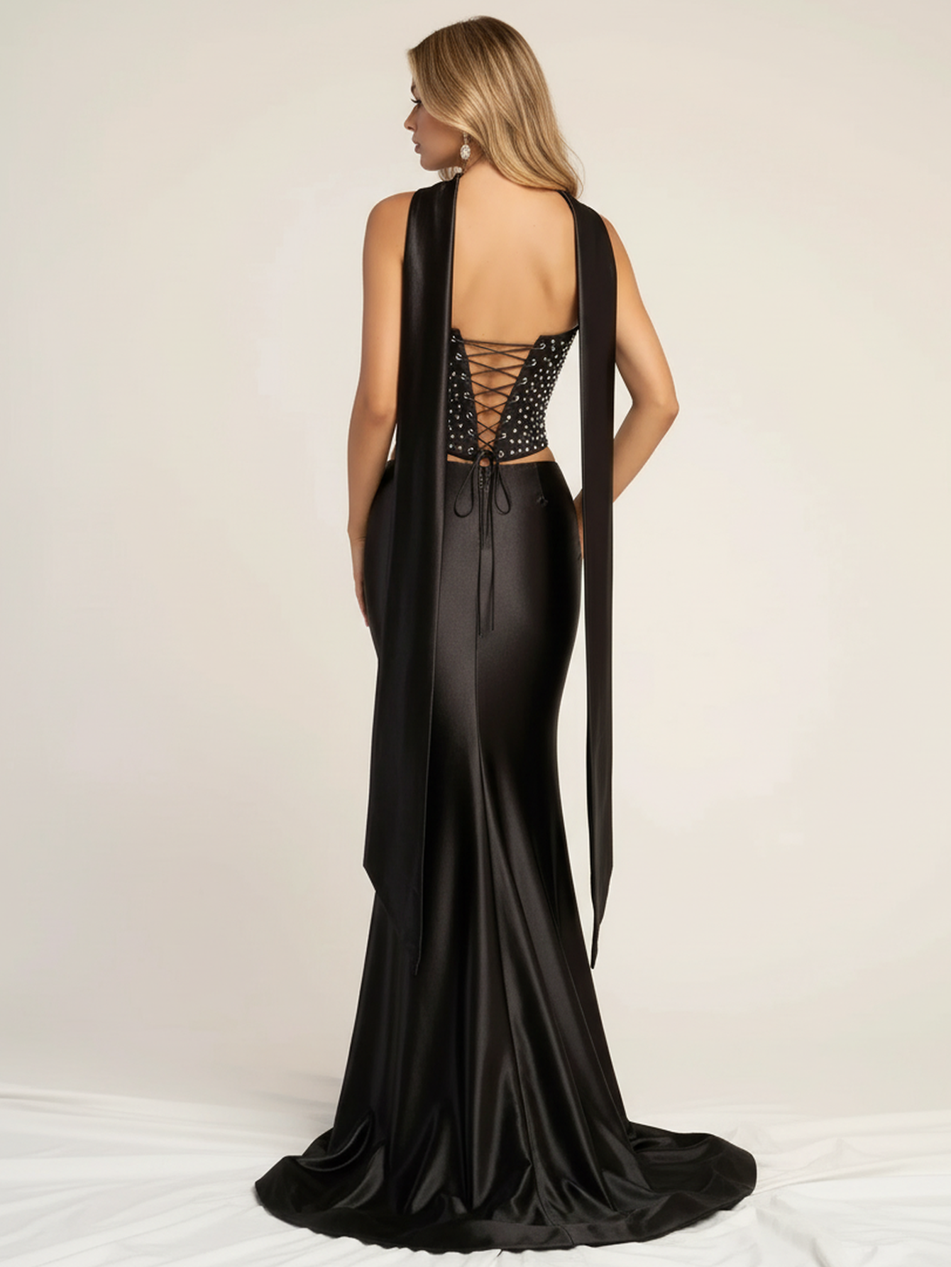 Two Pieces Hot Fix Crystal Corset Long Mermaid Prom Dress With Shawl - Black