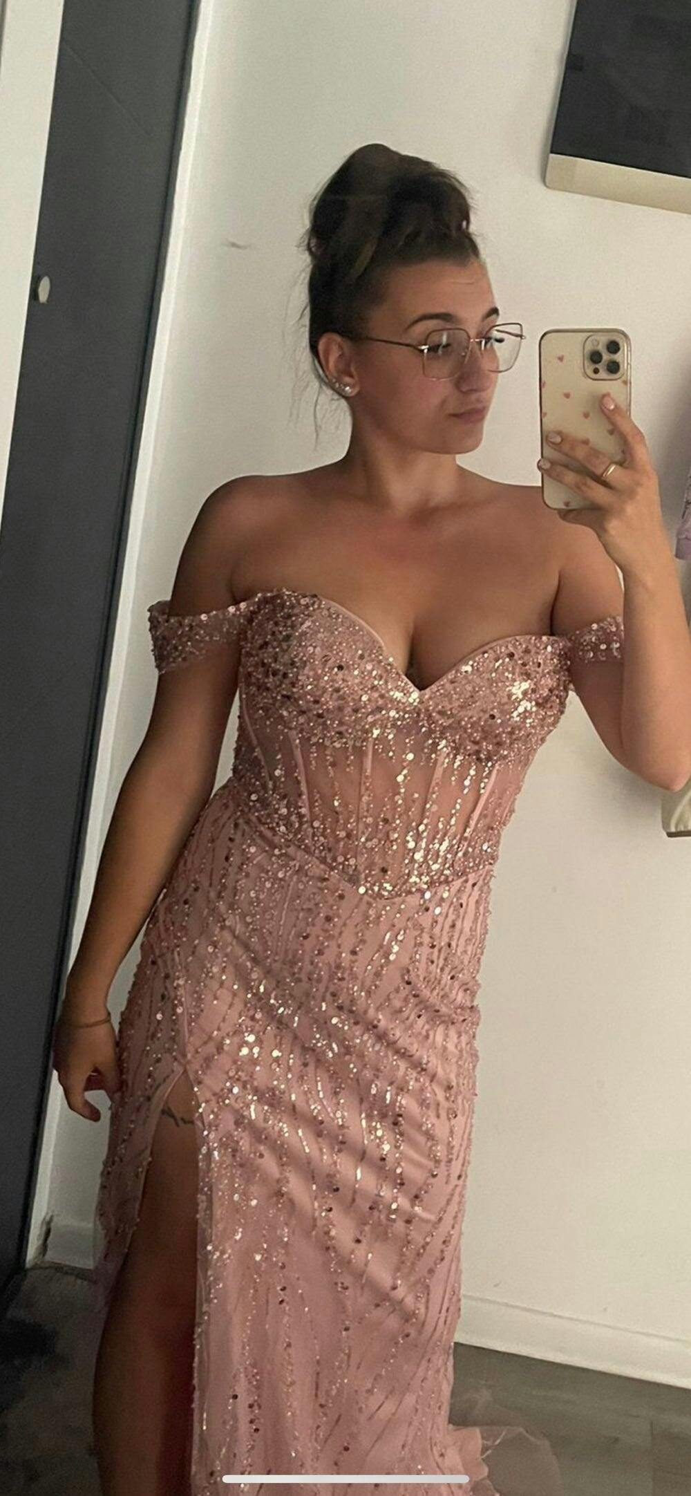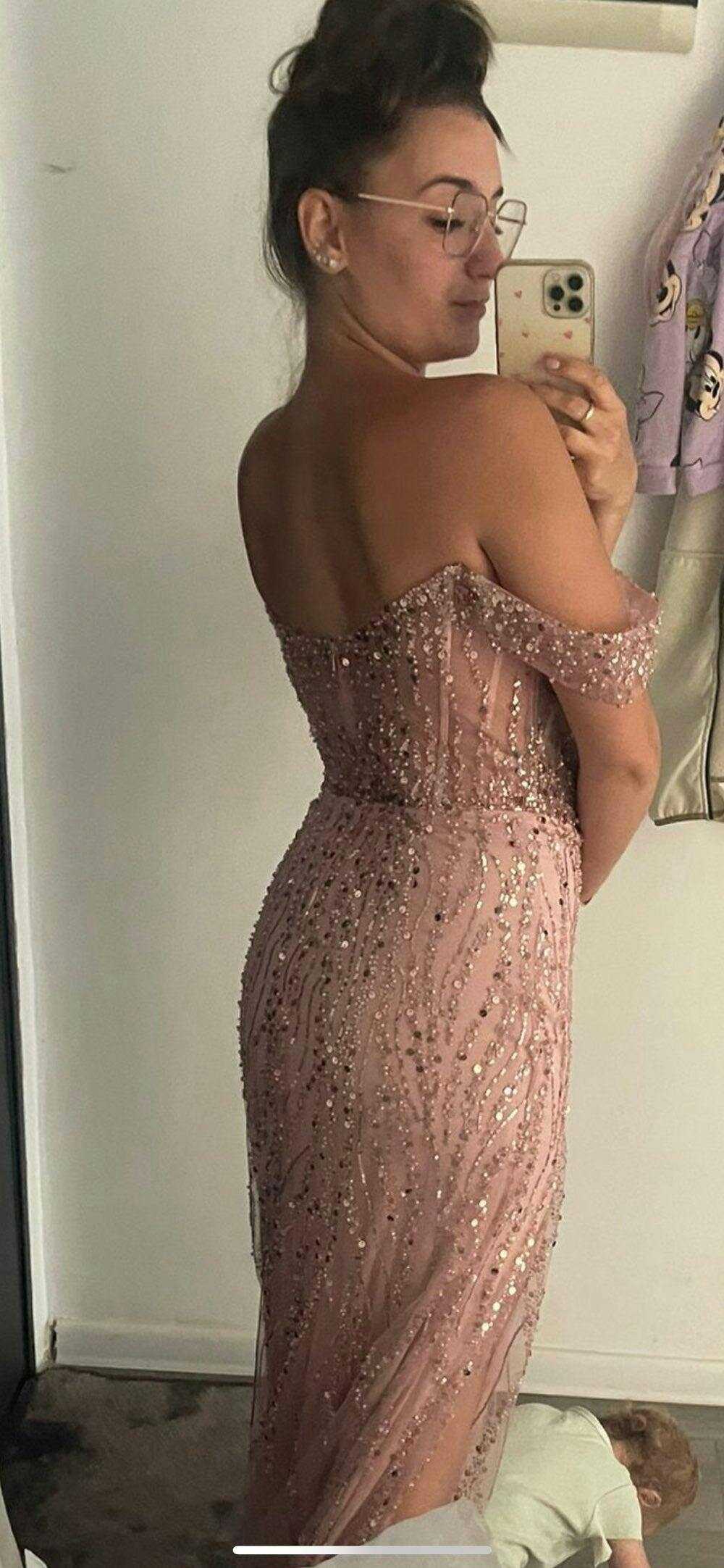 This satin prom gown features hand beading on the boned bodice. The off shoulder dress has a V-neck and split hem. Elegant crystal formal dresses are ideal for party, evening or festivals.