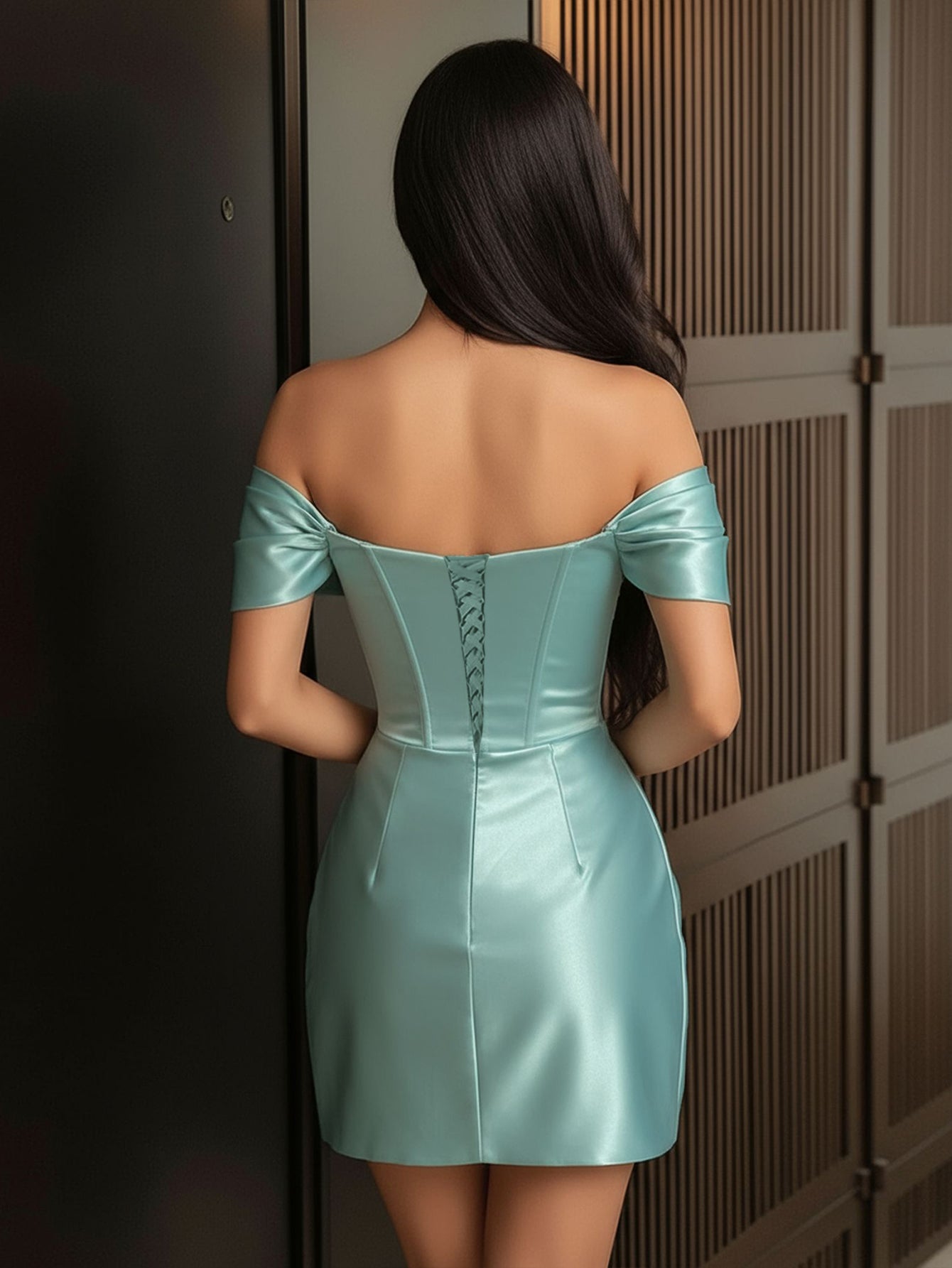 Off Shoulder Boned Pleated Mini Prom Dress - Baby Blue
