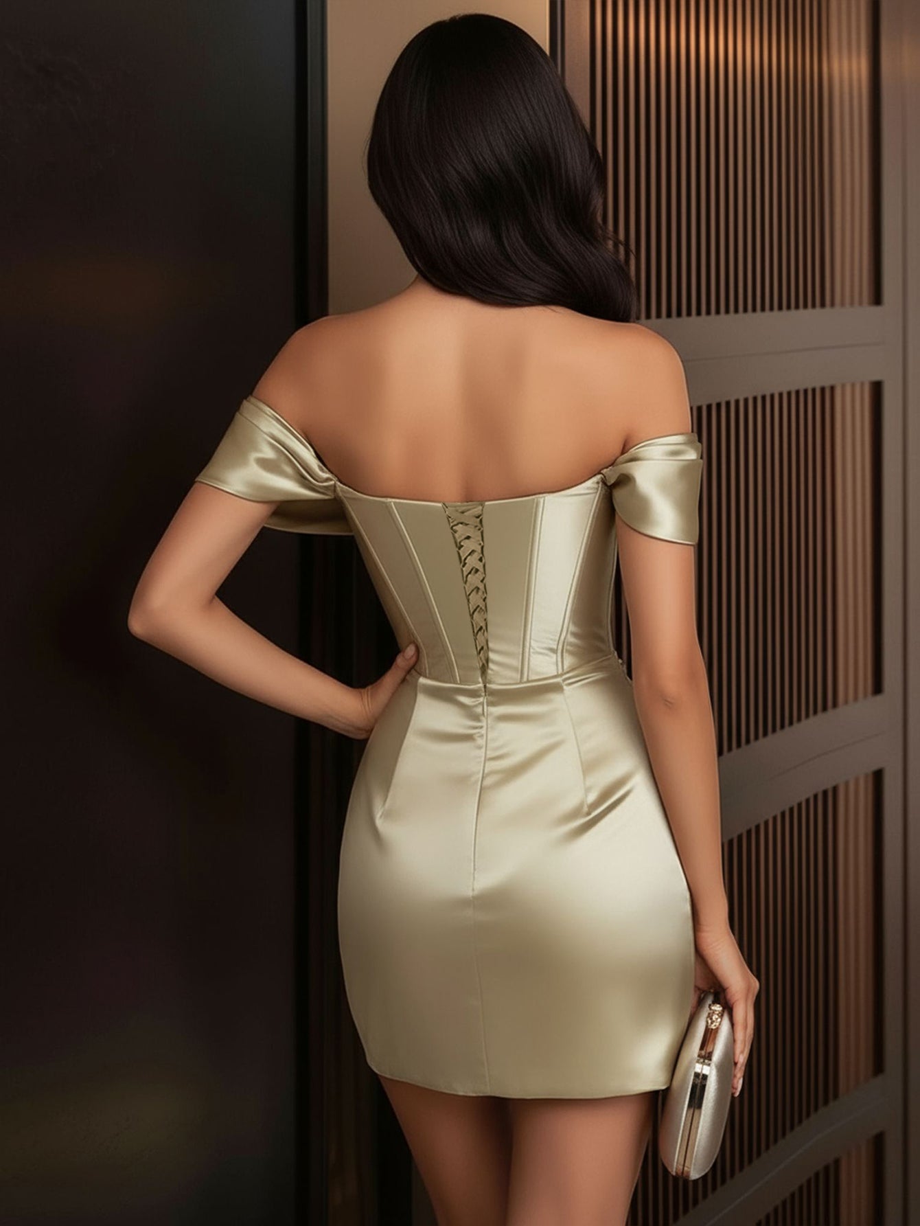 Off Shoulder Boned Pleated Mini Prom Dress - Champagne