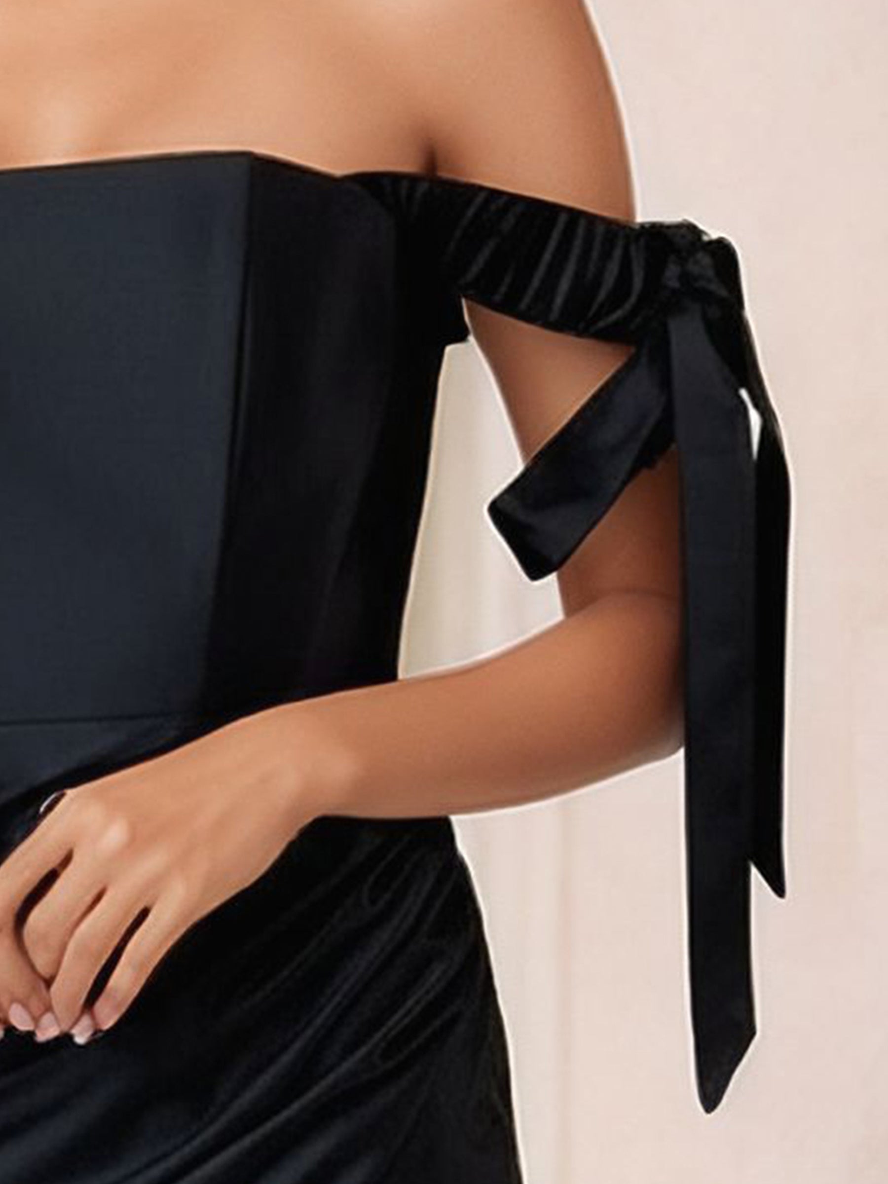 This stretch satin short prom dress features off shoulder with bows on the bodice. The ruched homecoming dress has a pleated hem. The classy little black dress is ideal for graduation party, homecoming or prom party.