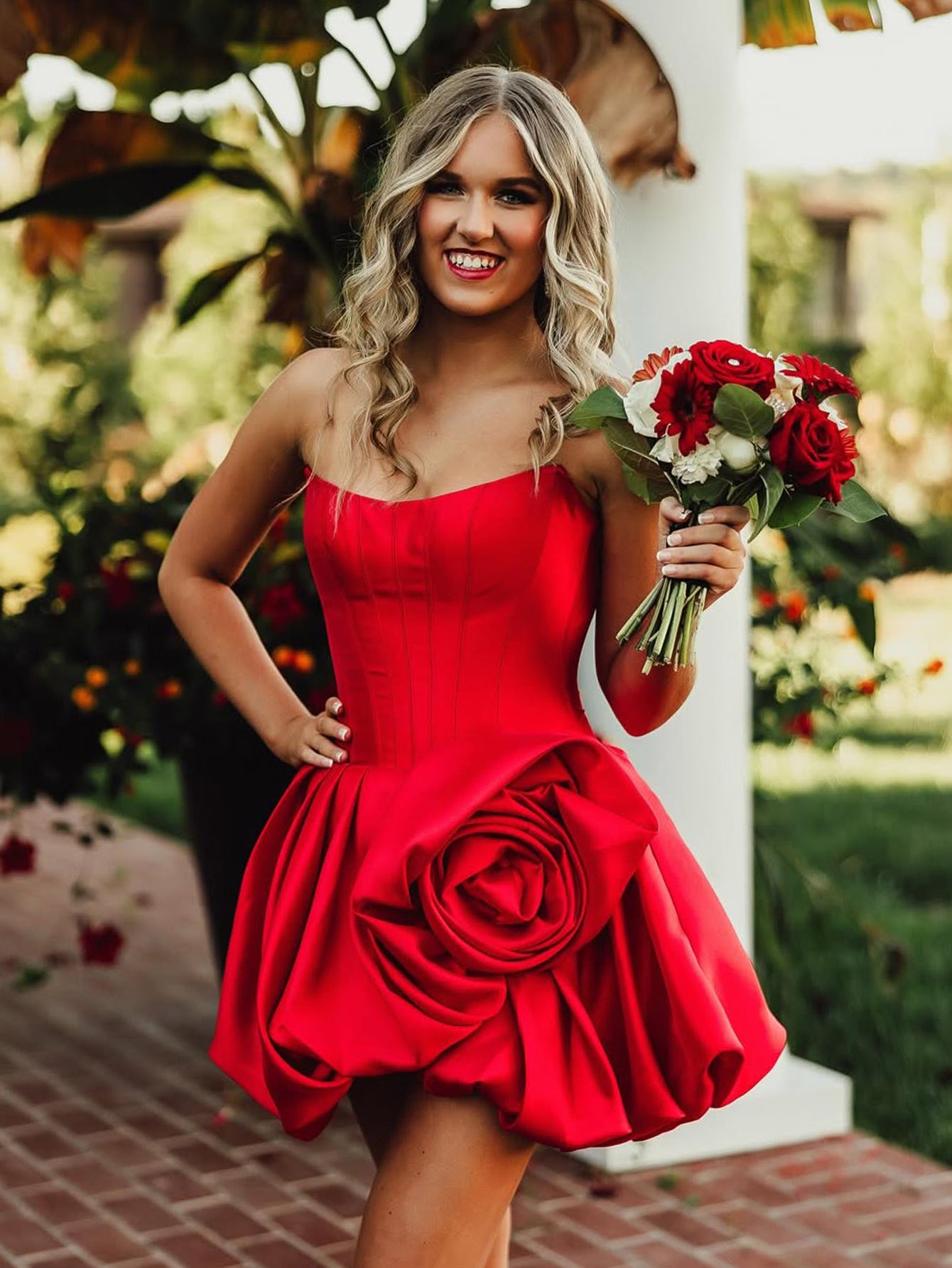 This satin short prom dress features pleated boned on the bodice. The strapless mini dress has a scoop neck and pleated hem. The hoco puffy dress is ideal for graduation party, homecoming or prom party.