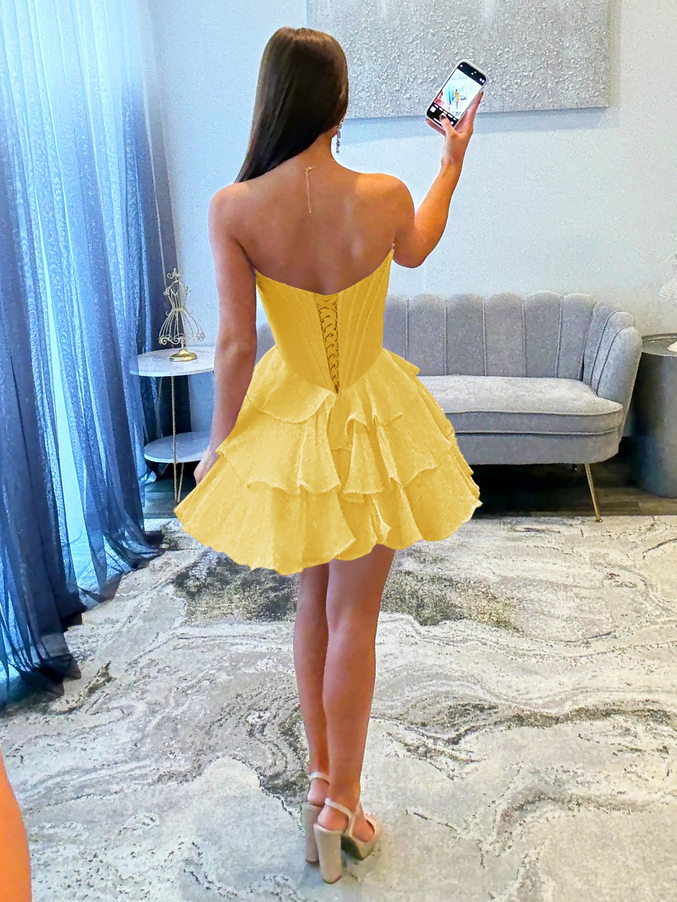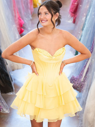 This chiffon short prom dress features boned ?on the bodice. The strapless mini dress has a sweetheart neck and ruffle layered hem. The sexy yellow hoco dress is ideal for graduation party, homecoming or prom party.