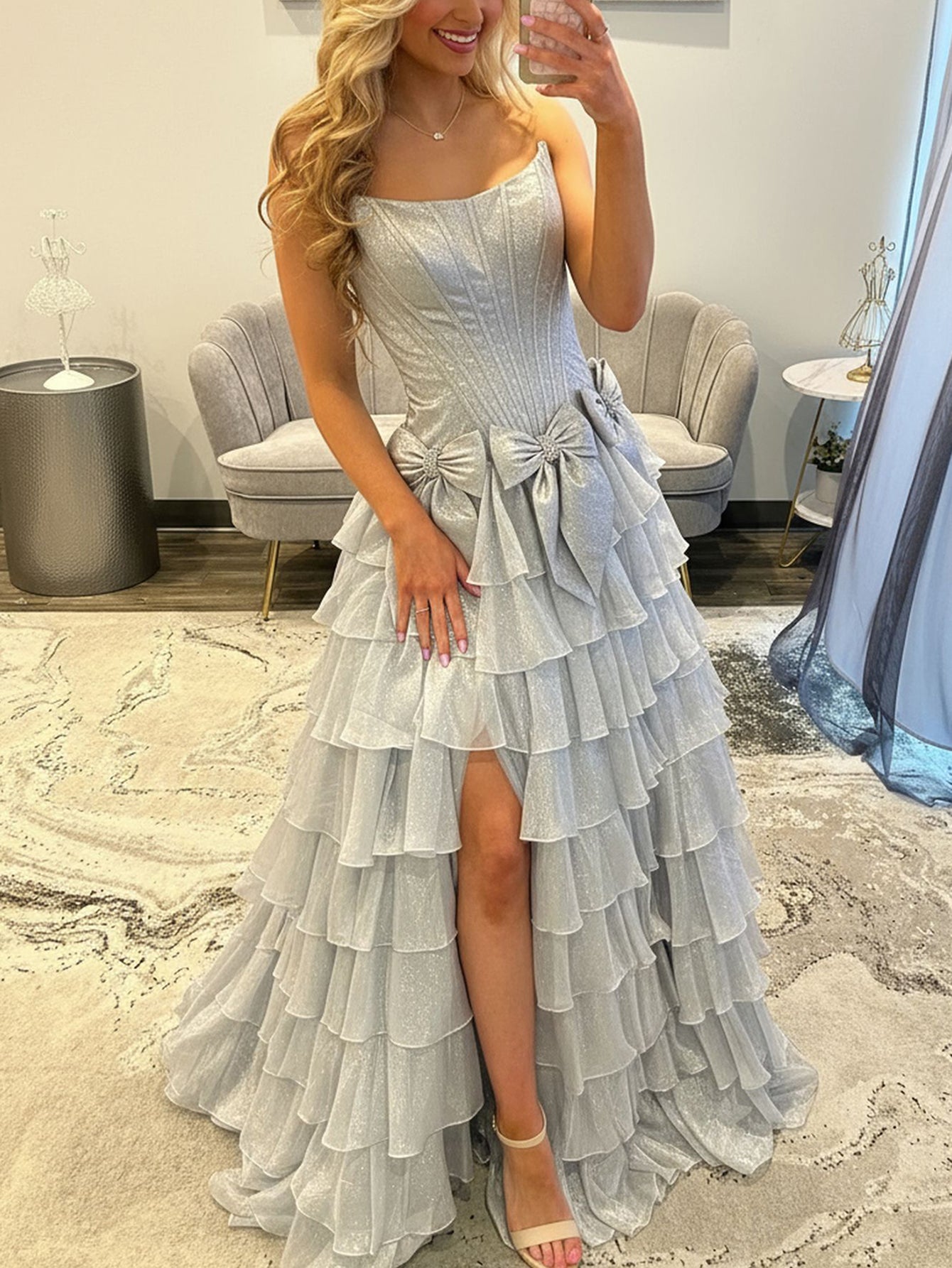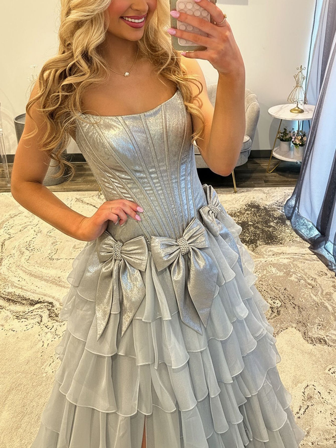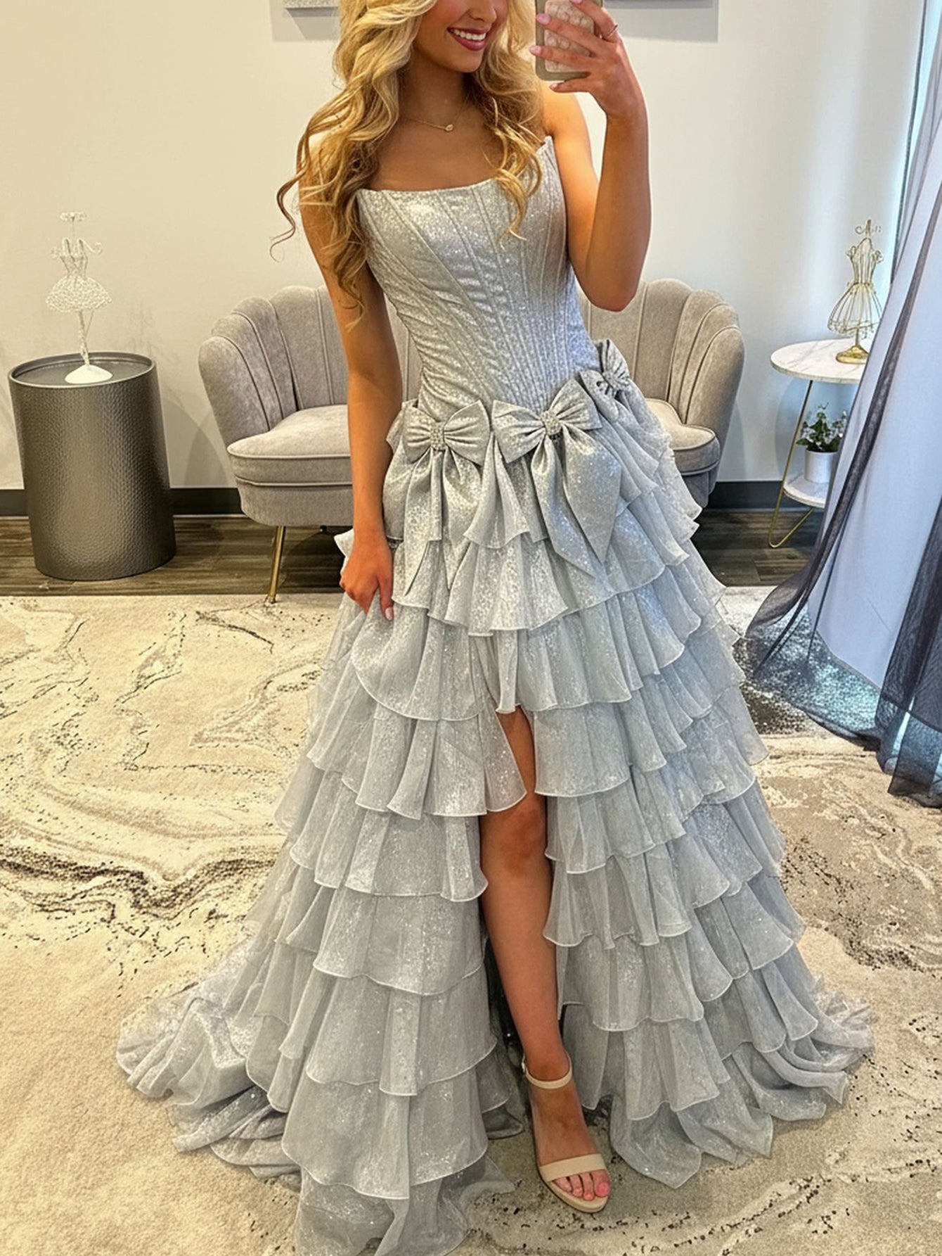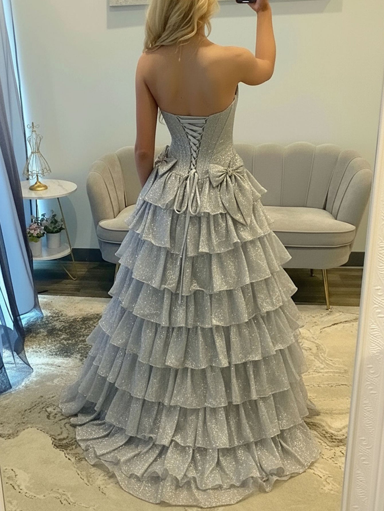 Boned Strapless Tiered Ball Gown Prom Dress Long With Bow - Silver