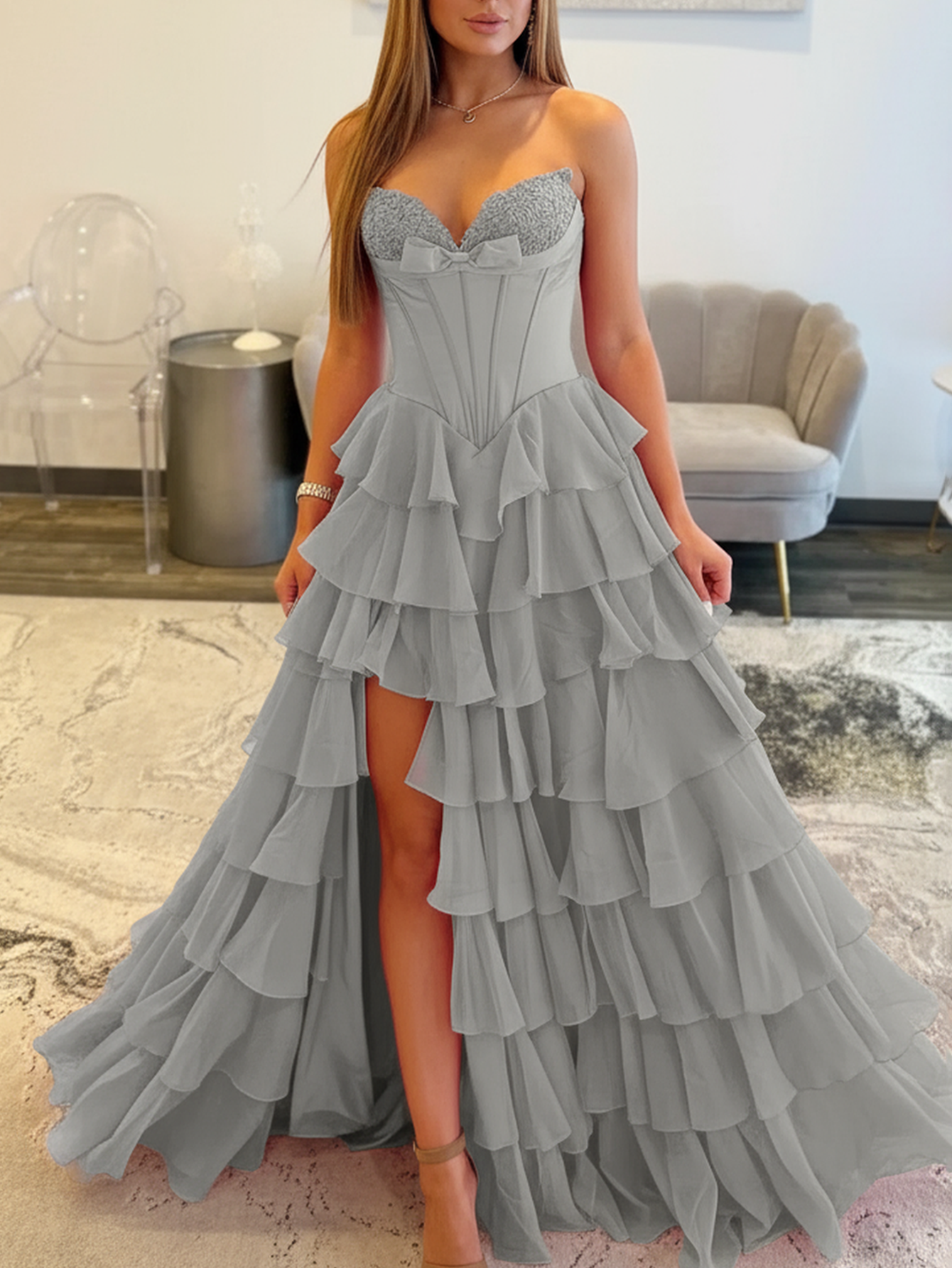 Lace Embroidery Boned Layered Ball Gown Prom Dress - Silver