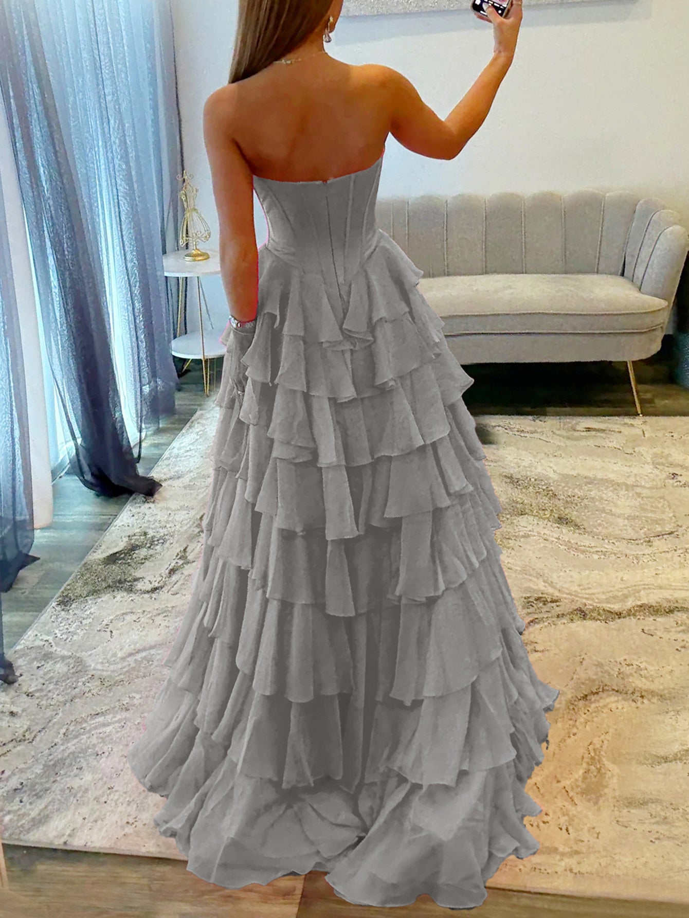 This chiffon prom gown features lace embroidery on the bodice. The strapless maxi dress has a sweetheart neckline and layered hem. This ball gown formal dress is ideal for party, evening or festivals.