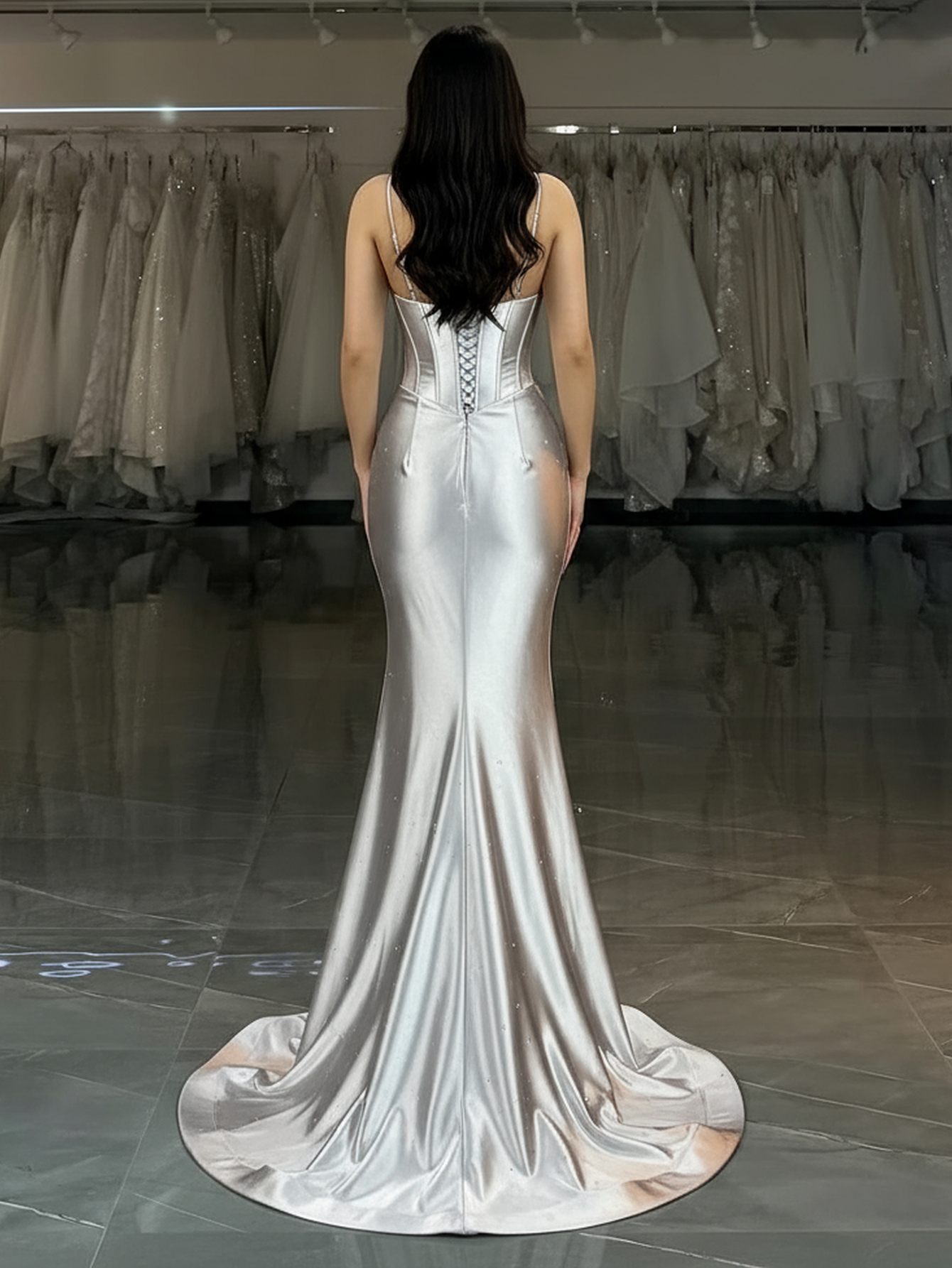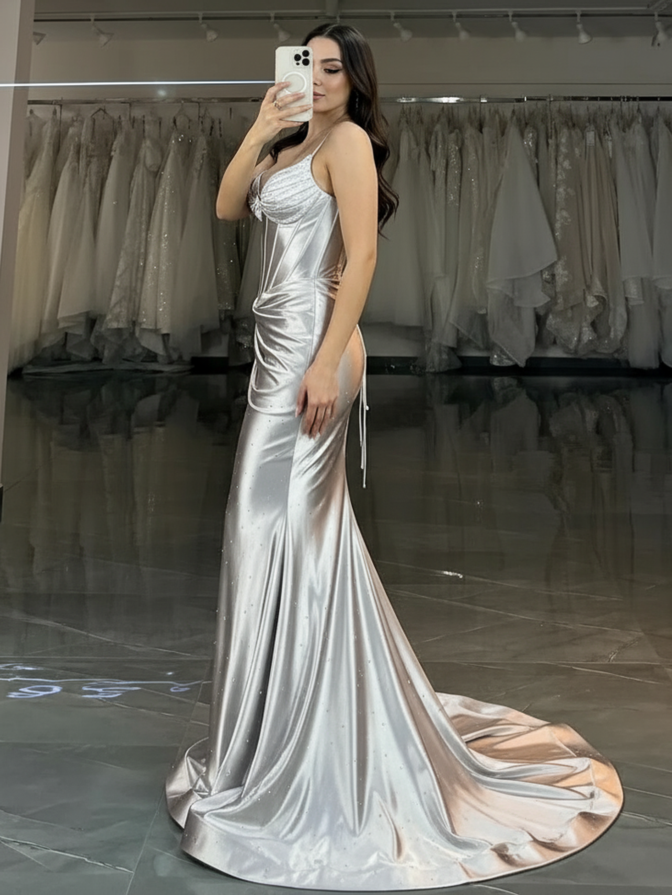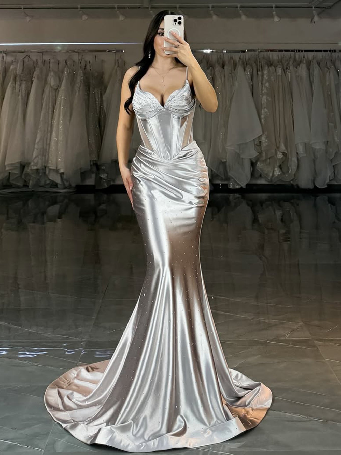 Spaghetti Strap Hand Beading Ruched Bodice Mermaid Prom Dress - Silver