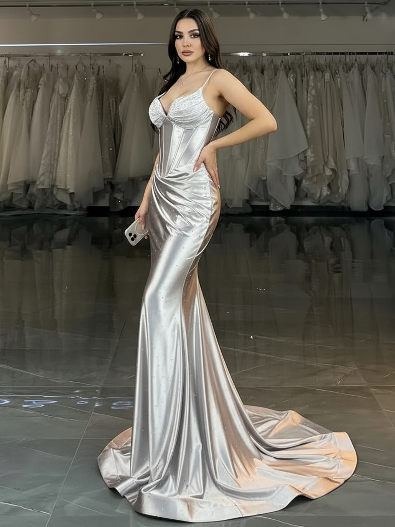 This stretch satin prom gown features ruched bust with beading on the bodice. The spaghetti strap dress has a V-neckline and pleated hem. Worldprom mermaid prom dresses are ideal for party, evening or festivals.